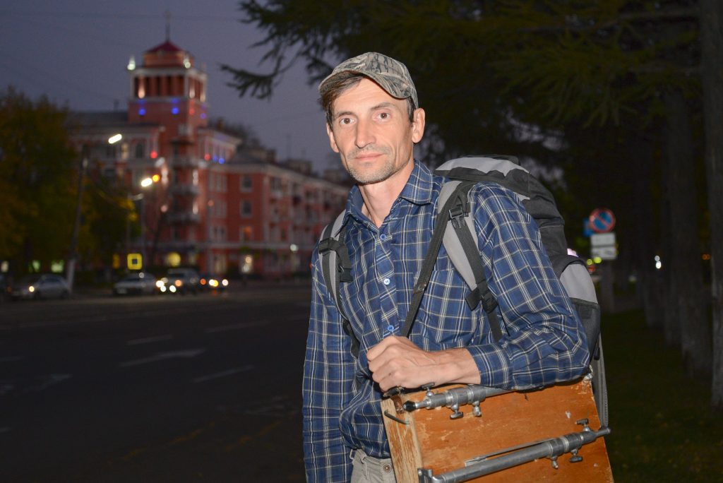 — За спиной у меня рюкзак с вещами, на плече этюдник с красками, в свободной руке пакет с написанными картинами и сумка с картонками. А ещё у меня есть две флейты, на которых периодически играю в разных городах.