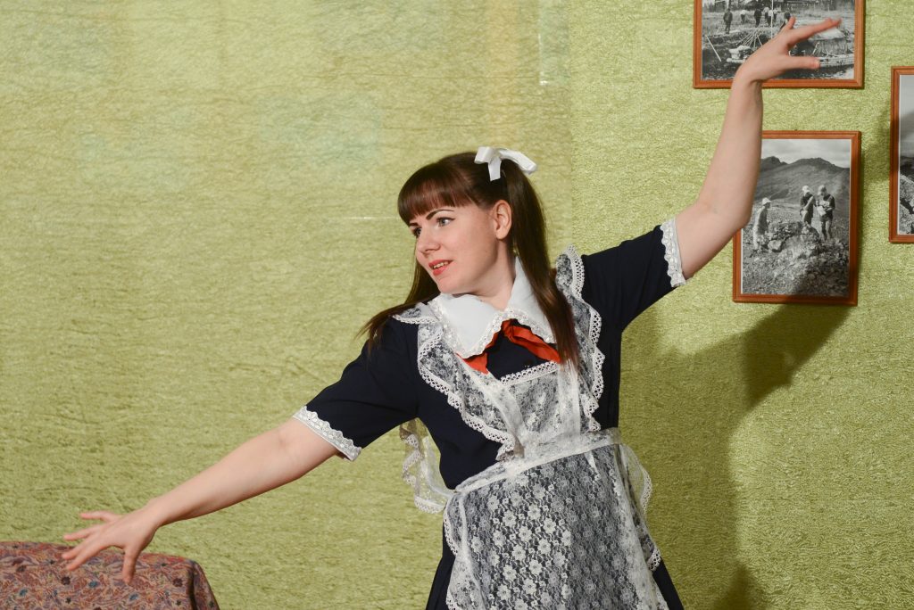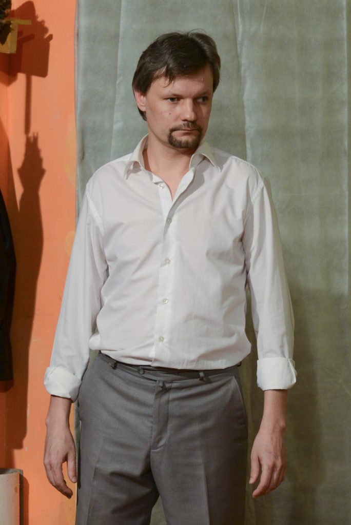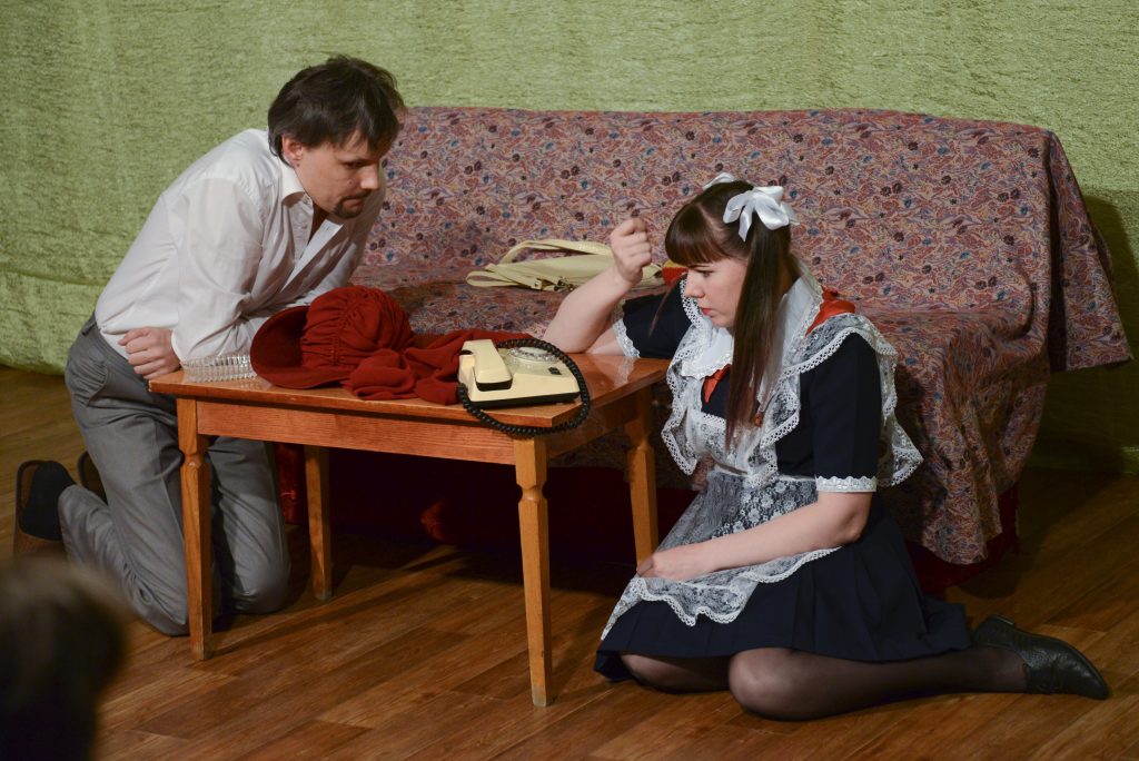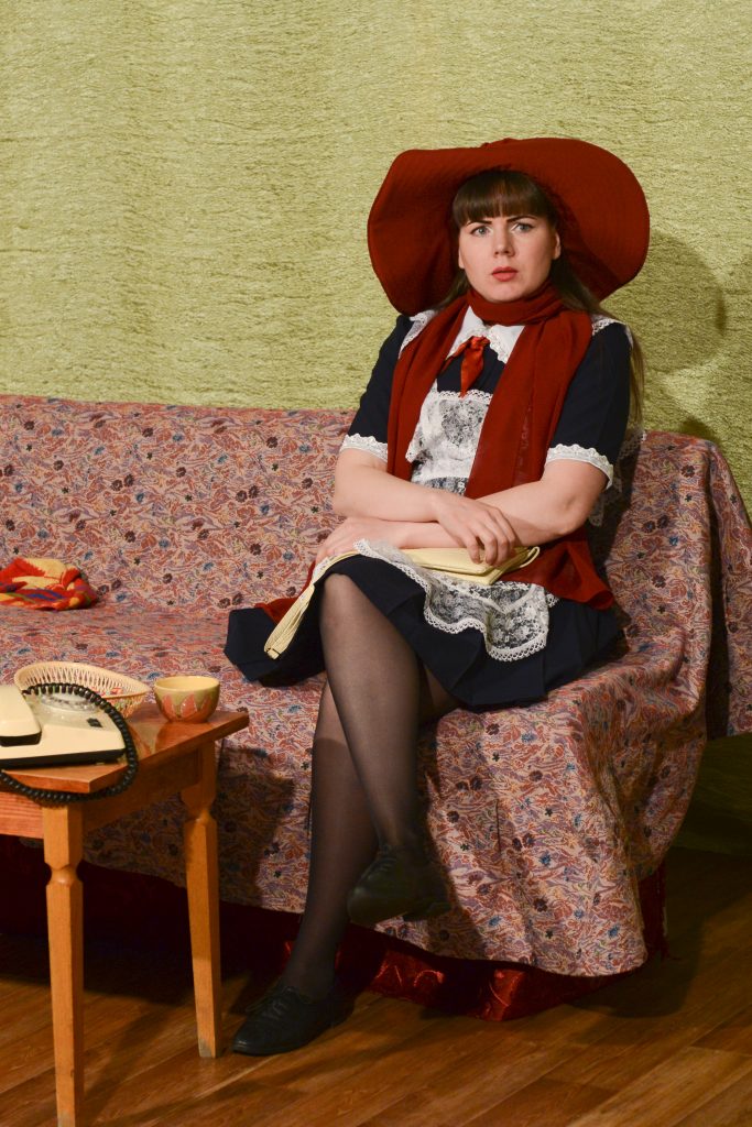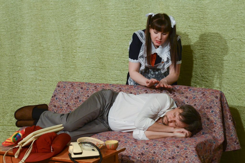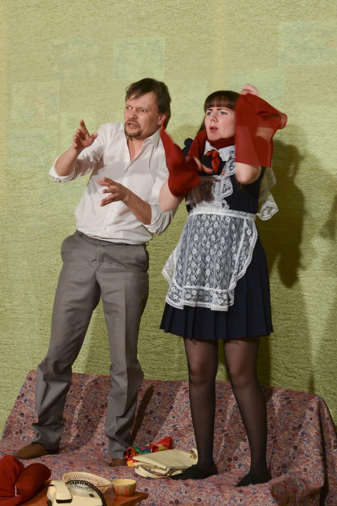 Кстати, что там с переодеванием? Да всё просто – дамочка выскочила из театра и побежала наводить разборки прямо в сценическом костюме. Поэтому Василий, когда помогает ей снять плащ (который тоже станет почти отдельным героем постановки), к своему изумлению, обнаруживает, что мамаша одета в школьную форму и пионерский галстук. Впрочем, темперамент Елены Лесновой говорит о том, что она способна играть не только возрастных травести из провинциальных театров, но и настоящую школьницу.