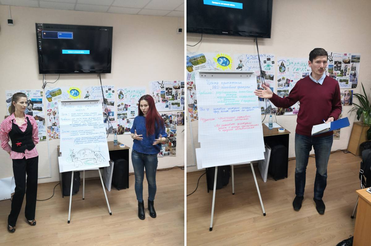 По окончании интервью мы вернулись в аудиторию, где участники проектных групп презентовали свои разработки. Были предложены весьма интересные проекты. Так, Валерия Прилуцкая-Дигор и Виктория Пассар предложили создать в Комсомольске «Музей под открытым небом», который станет площадкой для знакомства с культурными традициями различных народов, проживающих в городе. В проекте, представленном Сергеем Калашниковым, сошлись решения сразу нескольких проблем: наличие в городе пустырей и несанкционированных свалок мусора на них, отсутствие мест досуга в шаговой доступности. Такие пустыри он предложил превратить в комфортные места проведения досуга с необходимой инфраструктурой для проведения культурно-спортивных мероприятий. Андрей Дзюба со своей командой увидели проблему в разобщенности активных жителей города и недостаточной информированности их о городских активностях, а потому предложил создать Центр притяжения «PRO-активных граждан». Анастасия Руина занимается тем, что создает спектакли с участием глухонемых, а потому она не понаслышке знает о проблемах людей, имеющих ограниченные возможности здоровья, — в первую очередь это отсутствие досуга и немобильность. Именно на их решение направлен её проект «Инвалиды — инвалидам». Каждая проектная идея была по-своему интересна и имела социальную направленность на конкретную целевую группу. При этом их реализация не требует каких-то особо больших трат.
