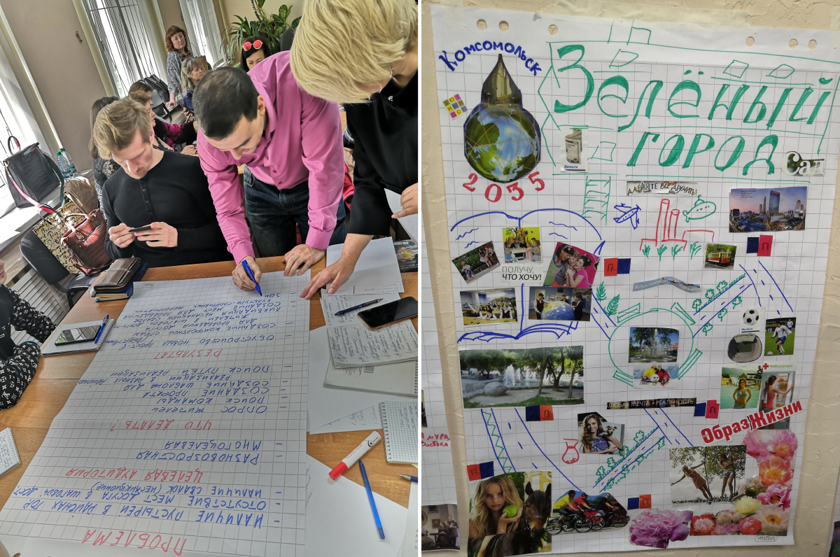 Что касается образа будущего, то здесь можно отметить такой интересный факт. В ходе семинара все участники разделились на шесть групп, каждая из которых представила свою картину будущего, но при этом ни одна из них не противоречила друг другу. Во всех этих картинах были ключевые моменты, которые независимо друг от друга признали важными все группы: это комфортный зелёный город, в котором живут активные люди, способные реализовать все свои интересы и возможности, развивать свои таланты. Почти все группы отмечали, что хотели бы видеть город наукоградом. Также они сказали, что хотели бы, чтобы вся страна, а то и весь мир узнали про Комсомольск-на-Амуре и люди мечтали бы приехать сюда и посмотреть, чем этот город так привлекателен. Не всегда так бывает, что при проектировании будущего разные группы рисуют практически одинаковую картину будущего. Это значит, что уже сейчас у активных комсомольчан есть скрепляющее их сообщество видение, которое позволит реализовать те изменения, о которых мечтают люди.