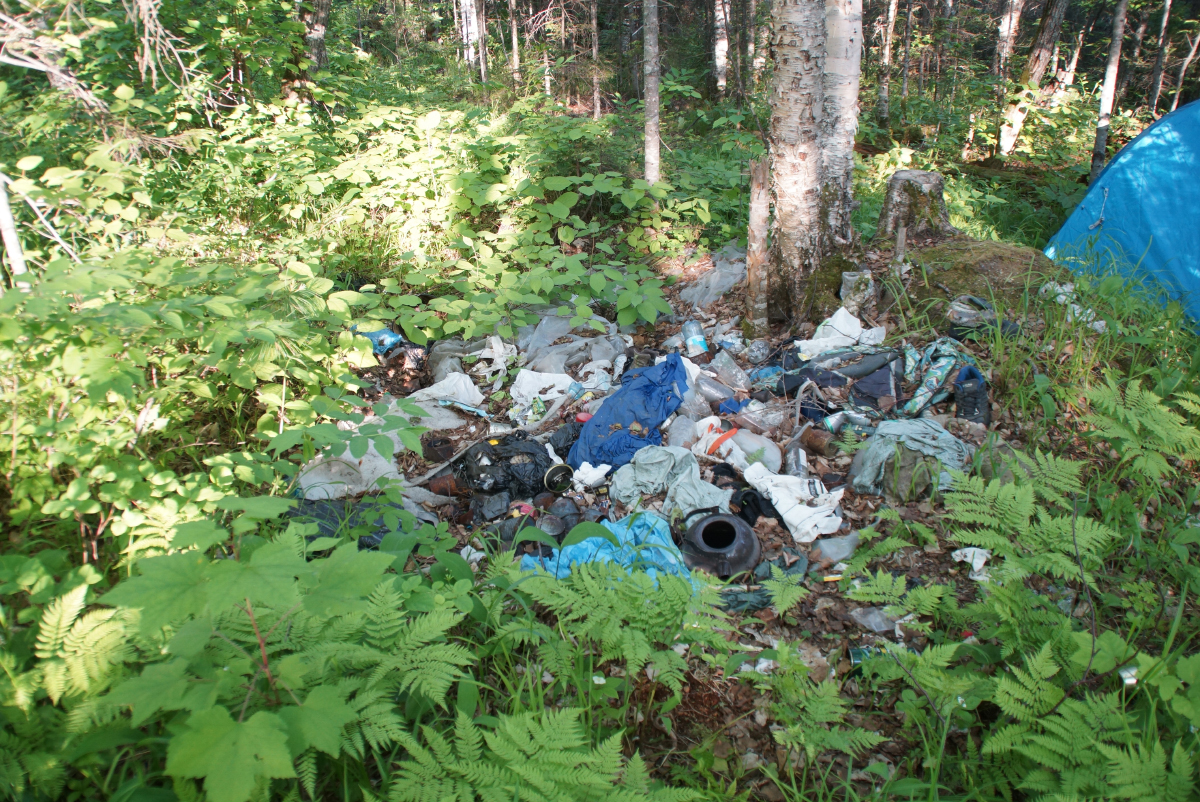 Понимаете, несанкционированная свалка в городе — это, конечно, плохо и фу так делать. Но всё же это город, множество людей, перманентное потребление, отсутствие урн и всё такое. А в тайге? Где всех прохожих можно собрать, поставить к стеночке и ликвидировать с одной пулемётной ленты? Как такое вообще возможно, что идущие к «месту силы» оставляют столько мусора?