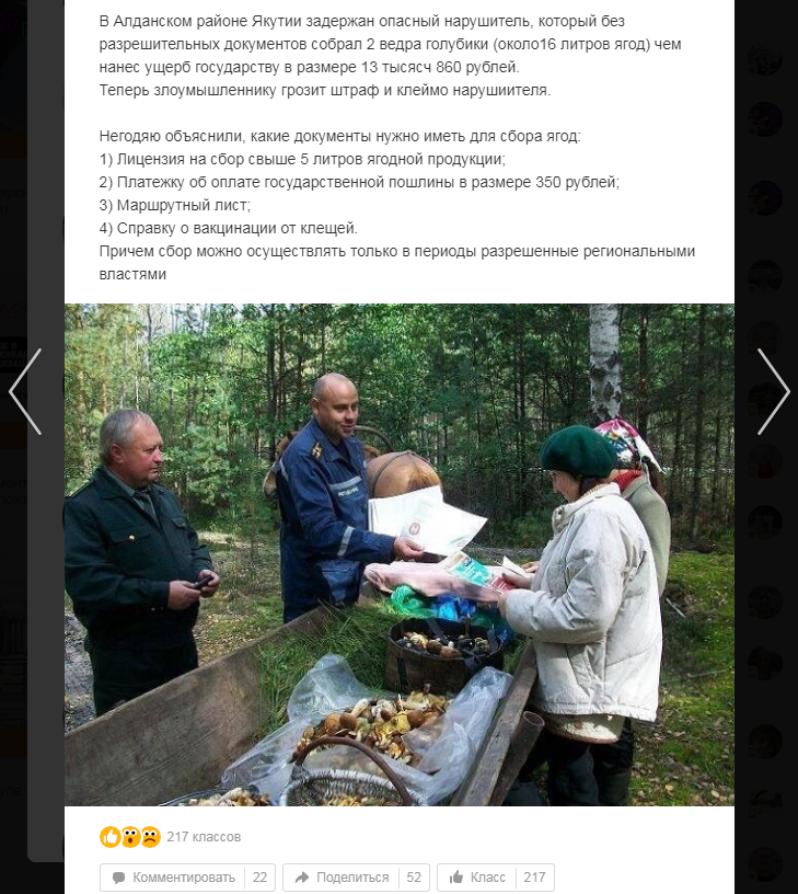 Этот вброс похож на спланированную акцию – в тот же день, когда сообщение пришло на WhatsApp, подобный пост появился и в «Одноклассниках». Правда, речь там шла о Якутии. Зато в посте был перечислен целый ряд документов, необходимых для того, чтобы получить разрешение на сбор дикоросов. И это особенно подозрительно – если нет законодательной нормы, не может быть и чётких требований к её соблюдению.