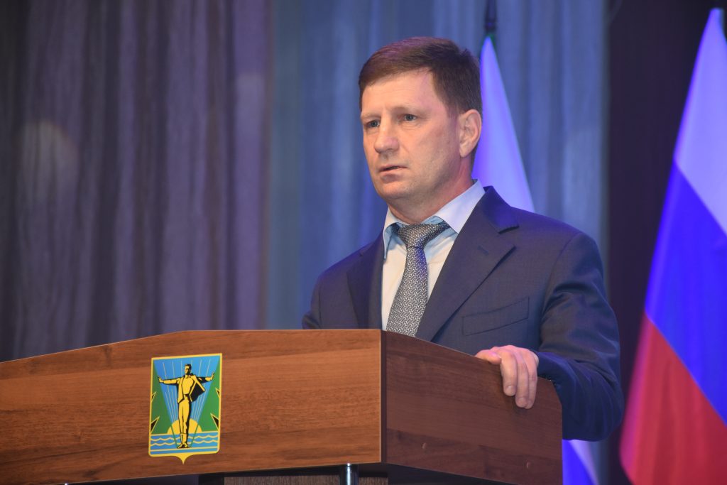 Ну а после этого настала очередь для поздравлений, и первым с вступлением в должность нового мэра поздравил губернатор Хабаровского края Сергей Фургал. Между прочим, напомню, что новый мэр и губернатор состоят в одной партии – ЛДПР.
