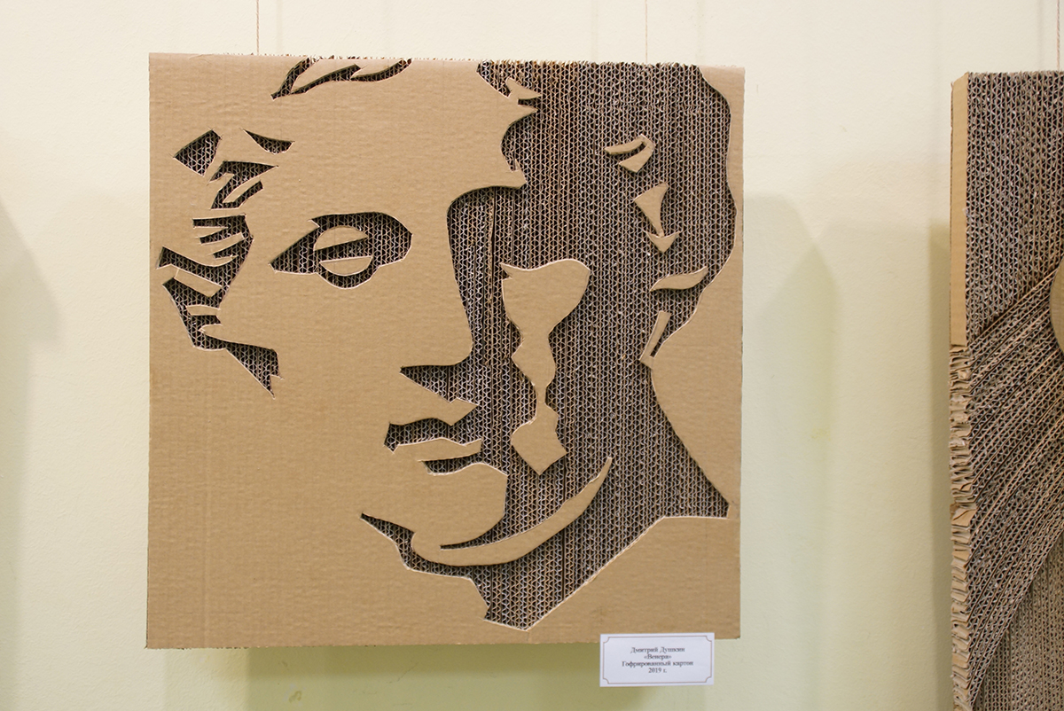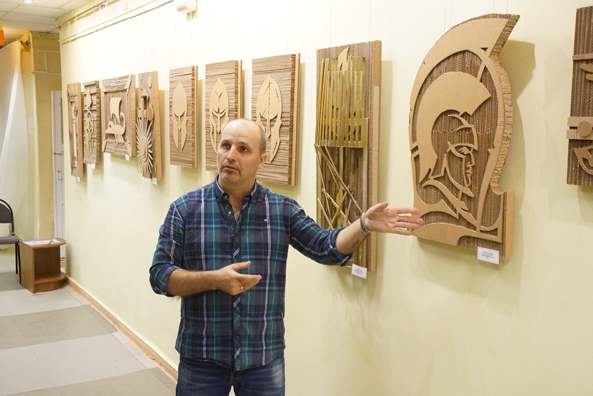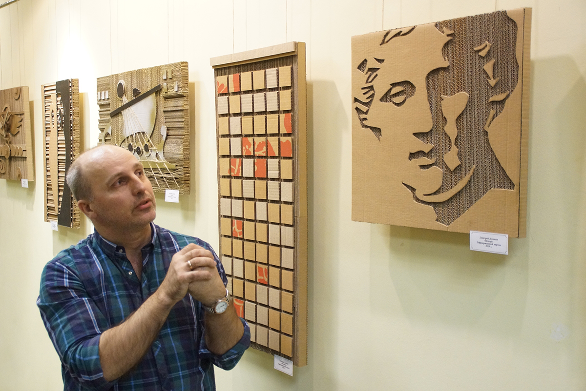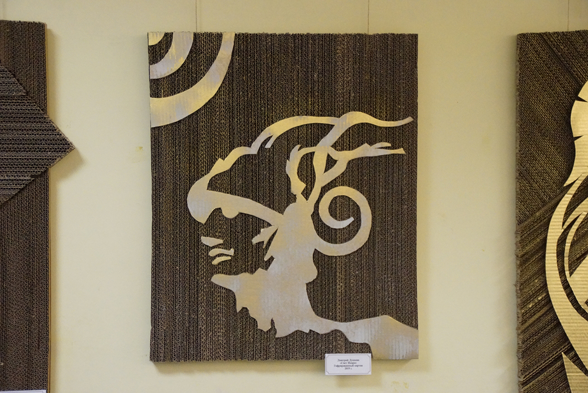 Дмитрий Игоревич создаёт свои картины из гофрированного картона. Но картинами их можно назвать весьма условно. Сочетая различные техники работы с этим, казалось бы, обычным материалом, на стенах библиотеки появилось около двух десятков объёмных арт-объектов. И каждый из них наполнен своим смыслом.
