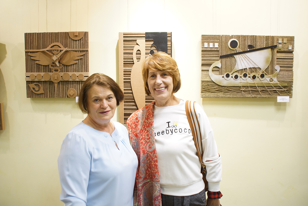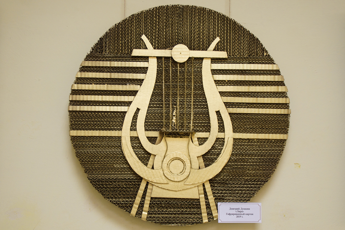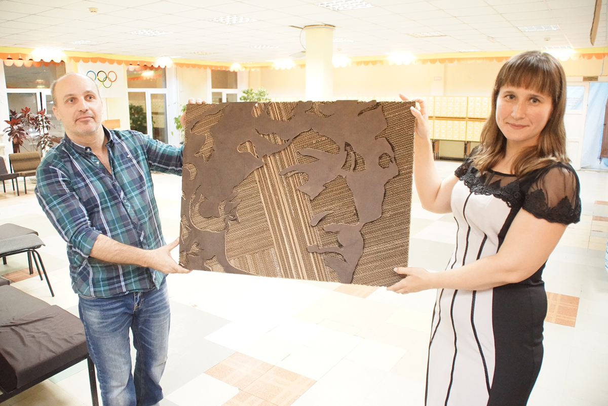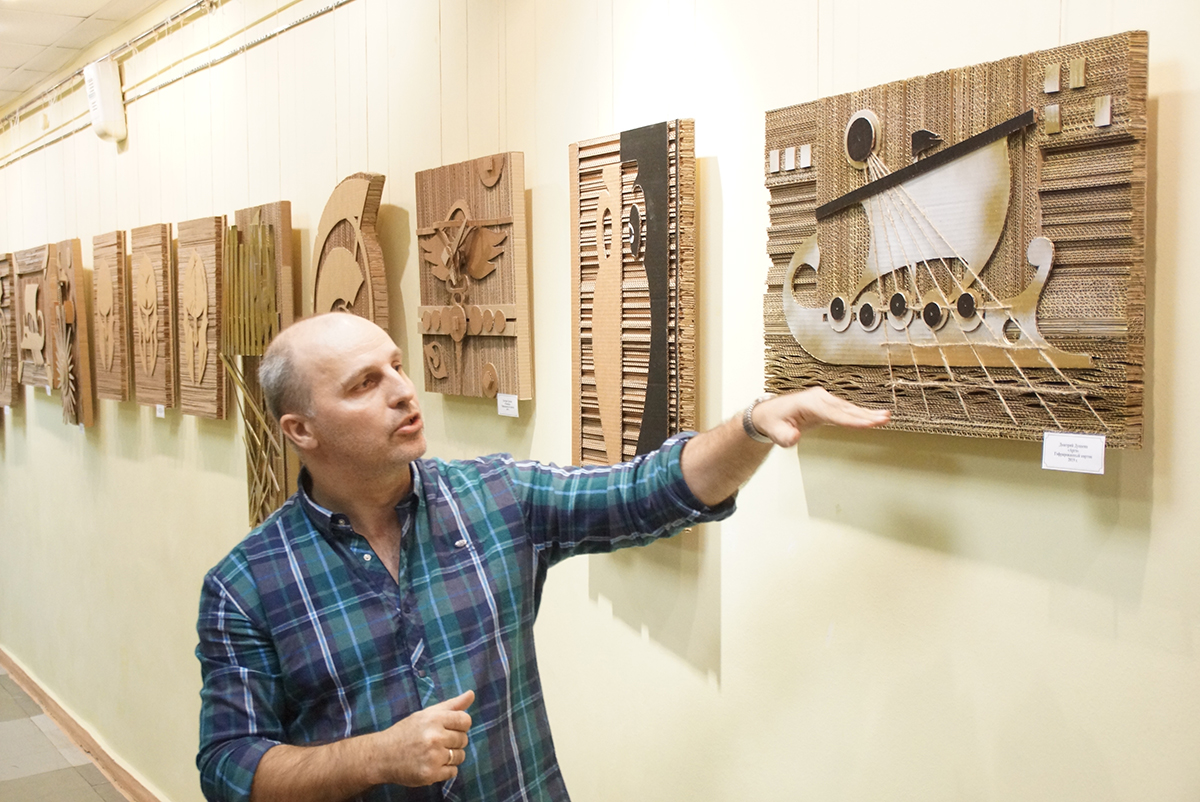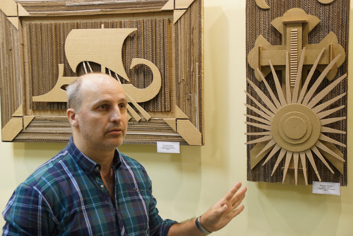 Дмитрий Игоревич создаёт свои картины из гофрированного картона. Но картинами их можно назвать весьма условно. Сочетая различные техники работы с этим, казалось бы, обычным материалом, на стенах библиотеки появилось около двух десятков объёмных арт-объектов. И каждый из них наполнен своим смыслом.