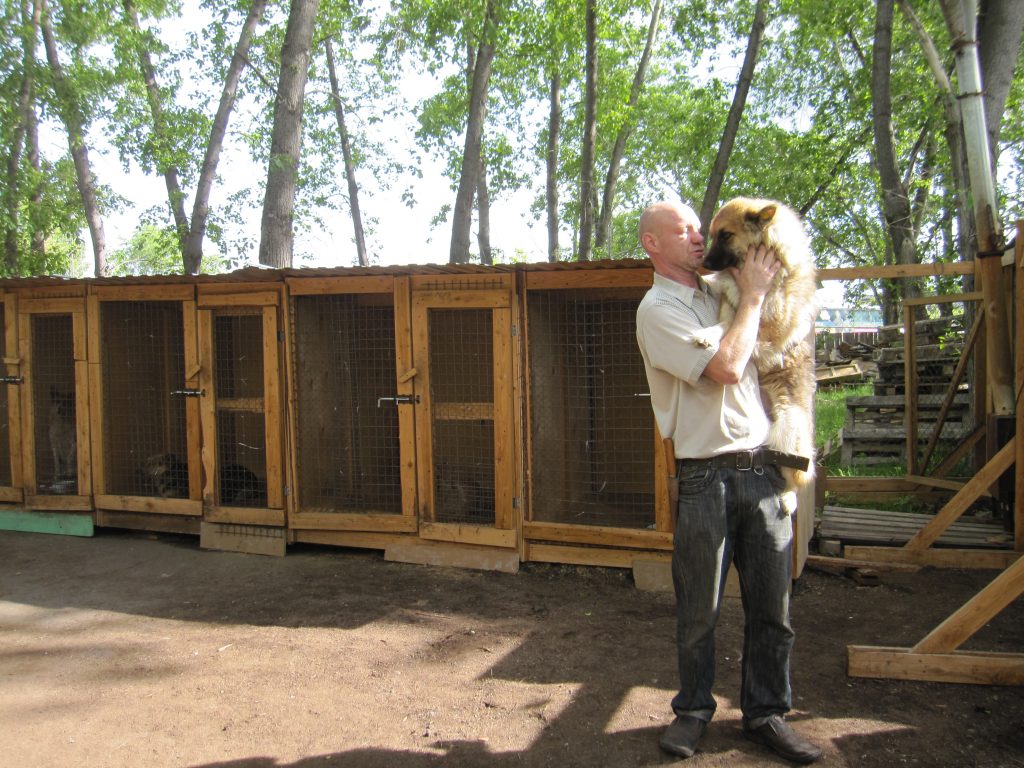 Этот человек оказался на улице год назад и по совету знакомых пришёл в приют. Теперь живёт здесь, работает в питомнике «Четыре лапы». На его попечении около двадцати собак, которым он как отец родной: кормит, убирает клетки, оказывает помощь при осмотре собак ветеринарами.