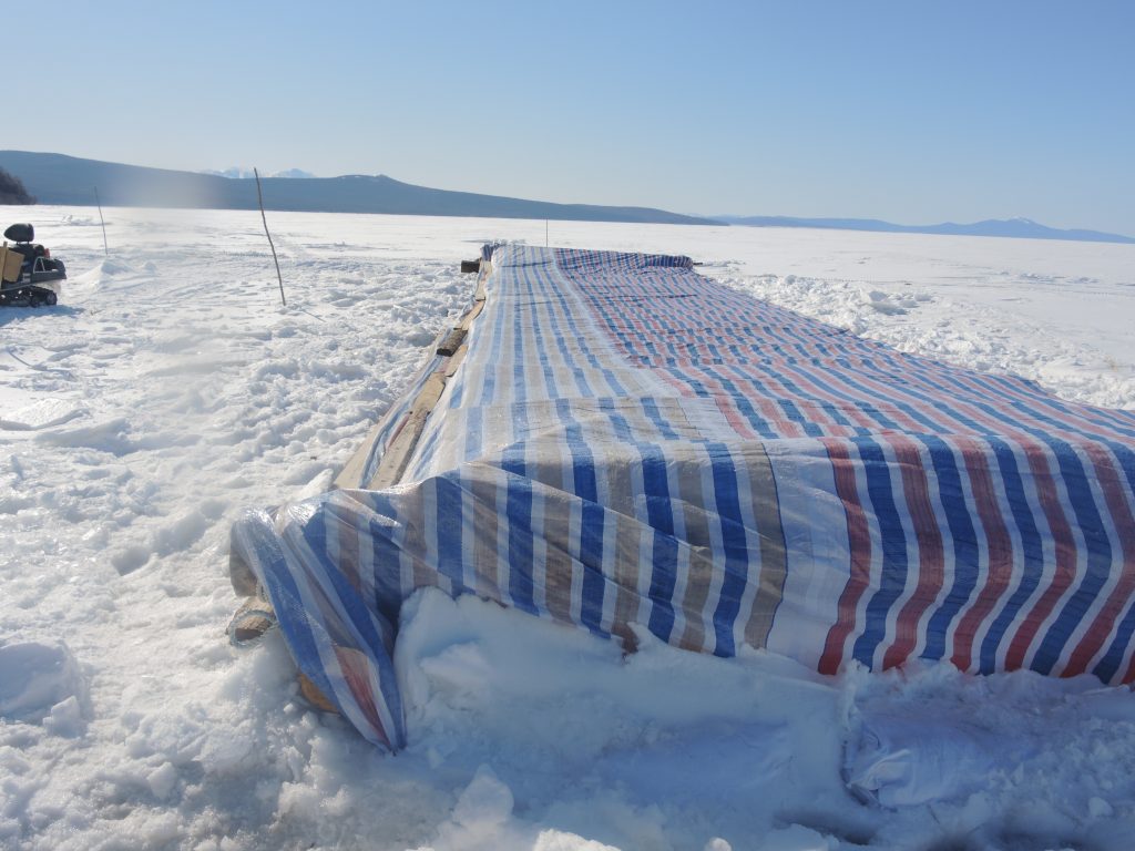 До Оремифа мчимся на джипе, оттуда к мысу Пронге на снегоходе. За рулём мой знакомый хабаровчанин, решивший половить корюшку на удочку напротив метеостанции Джаорэ. Там потрясающий клёв, зато за неводами в устье уже не клюёт. Не доезжая до мыса, сворачиваем в село Нижнее Пронге, рядом с которым до нулевых корюшку промышленники не ловили. В этом году основная часть их ловушек переместилась за мыс в Амурский лиман.
