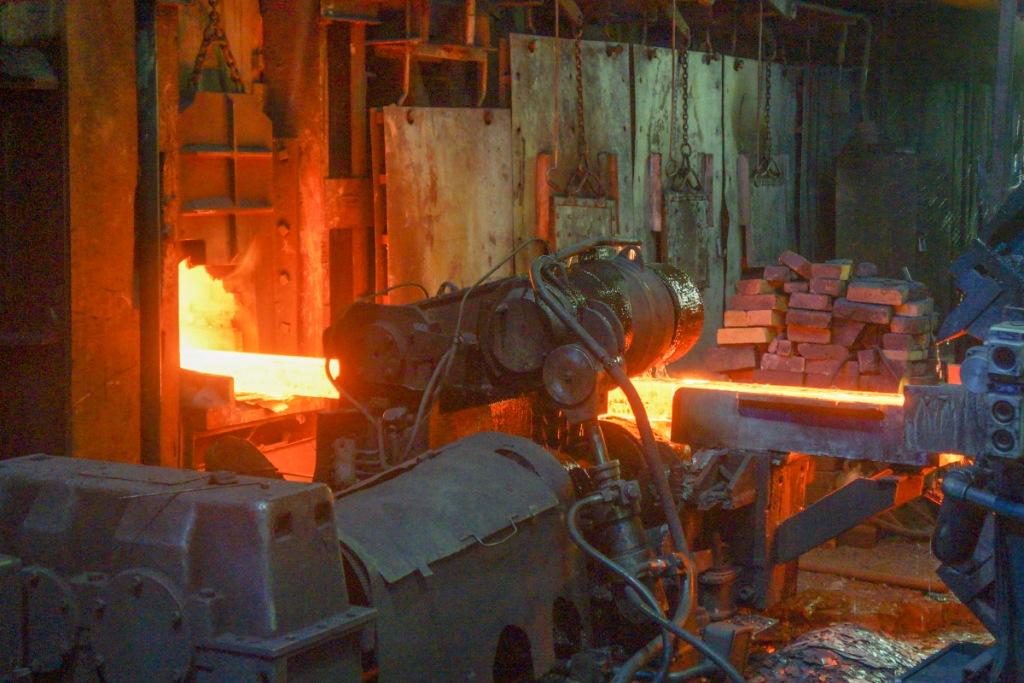 — Заготовка нагревается до температуры в 1200 градусов, — рассказал Сергей Майорович, начальник цеха. — Это нужно для того, чтобы она приняла пластические свойства и её можно было обжать или растянуть в нужный профиль. Без нагрева прокат невозможен. Печь работает круглосуточно, и останавливать её нельзя. В смене на ней трудятся по четыре человека.