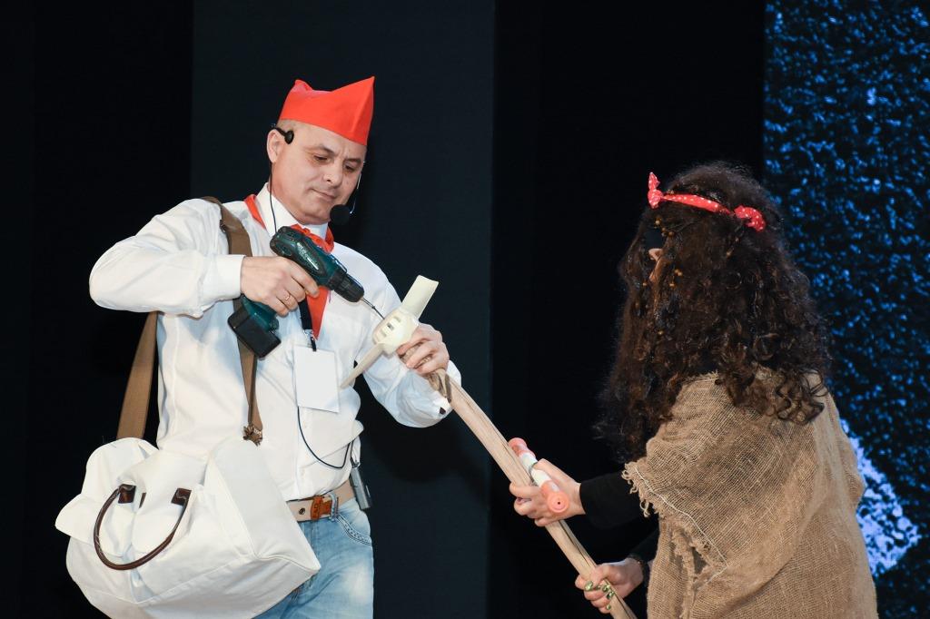 Конечно, в зале ДК Авиастроителей собрались в основном группы поддержки участников конкурса, каждая из которых знала своего претендента на победу. Однако участникам предстояло рассказать о себе и другим зрителям, а также жюри. И чем креативнее они это делали, тем ярче было первое впечатление. Большая часть участников пошли по традиционному пути – один снял видеофильм, другой рассказал о себе со сцены своими словами, третий подключил семью, решив, что это беспроигрышный вариант. Но не таков Юрий Святец. С помощью сотрудниц цеха на сцене он показал инсценировку по мотивам советского мультфильма «Ивашка из дворца пионеров». Ивашку, конечно, играл сам, благо в школе до самого восьмого класса состоял в числе пионеров. А вот роль бабы Яги исполнила Мария Кулагина. Кстати, Юрий говорит, что в жизни Мария не похожа на бабу Ягу, а совсем даже наоборот. Да и на сцене девушка лишь вначале изображала злого сказочного персонажа, а после того, как Ивашка Бабе Яге и дом починил, и метлу отремонтировал, она сама вдруг скинула лохмотья и стала прекрасной женщиной.