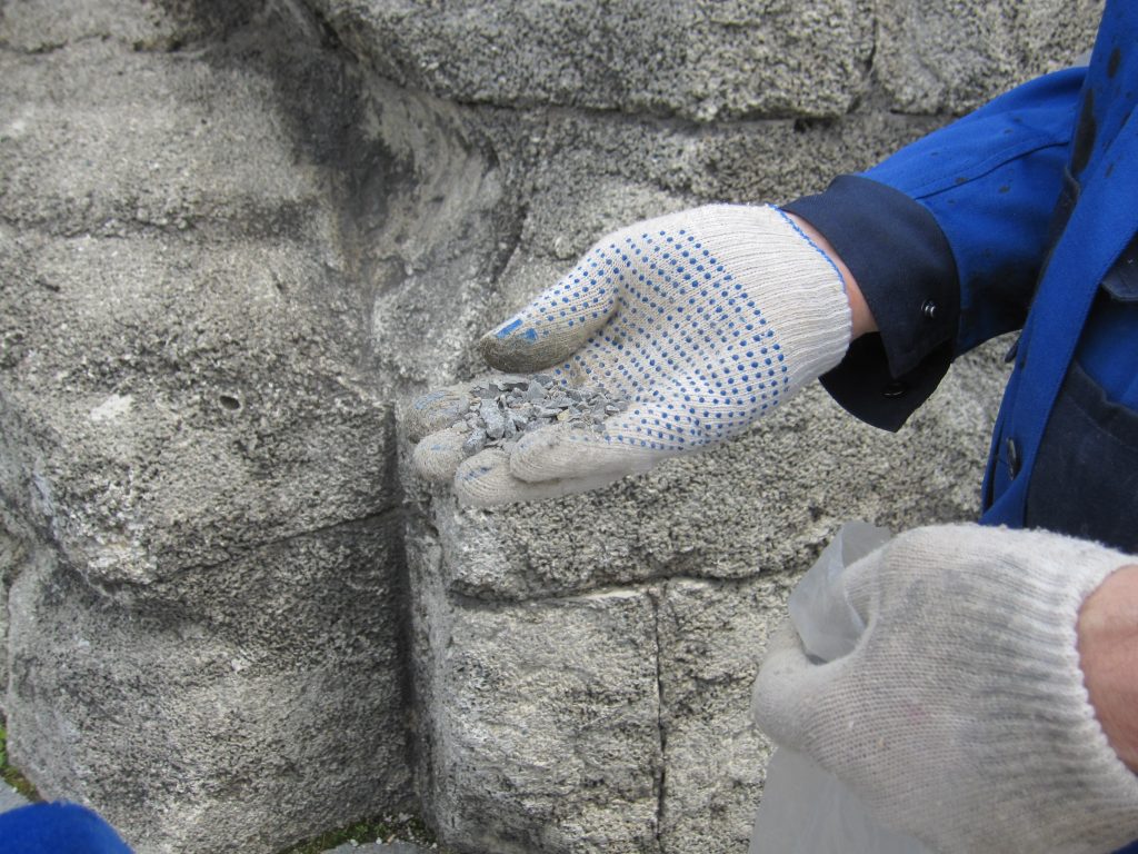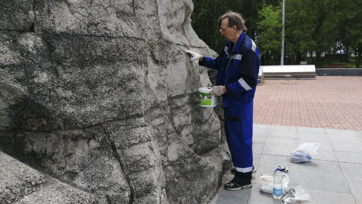 — Памятник создавался из небольших блоков, — говорит Игорь Геннадьевич. — Между ними есть стыки, в которые попадает вода. Зимой она замерзает, расширяет стык и разрушает монолитную конструкцию. Специальным цементным раствором проводится заделка стыков и декорирование гранитной крошкой.