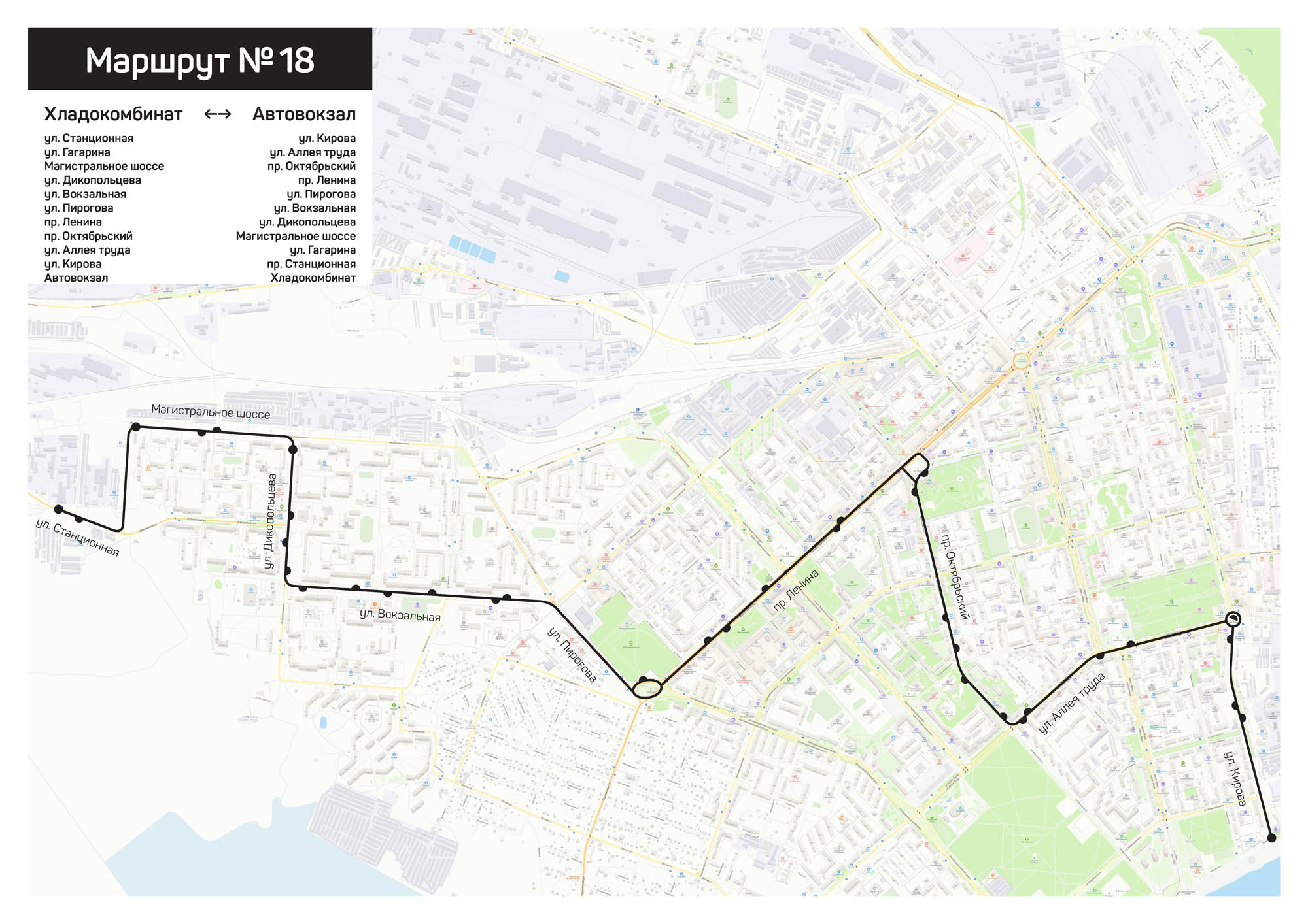По городу будет ходить так же, но станет длиннее. После ул. Дикопольцева (сейчас там конечная) добавятся три остановки – на Магистральном шоссе, ул. Гагарина и ул. Станционной (новая конечная). На другом конце маршрута после пл. Кирова добавятся две остановки с конечной на автовокзале.