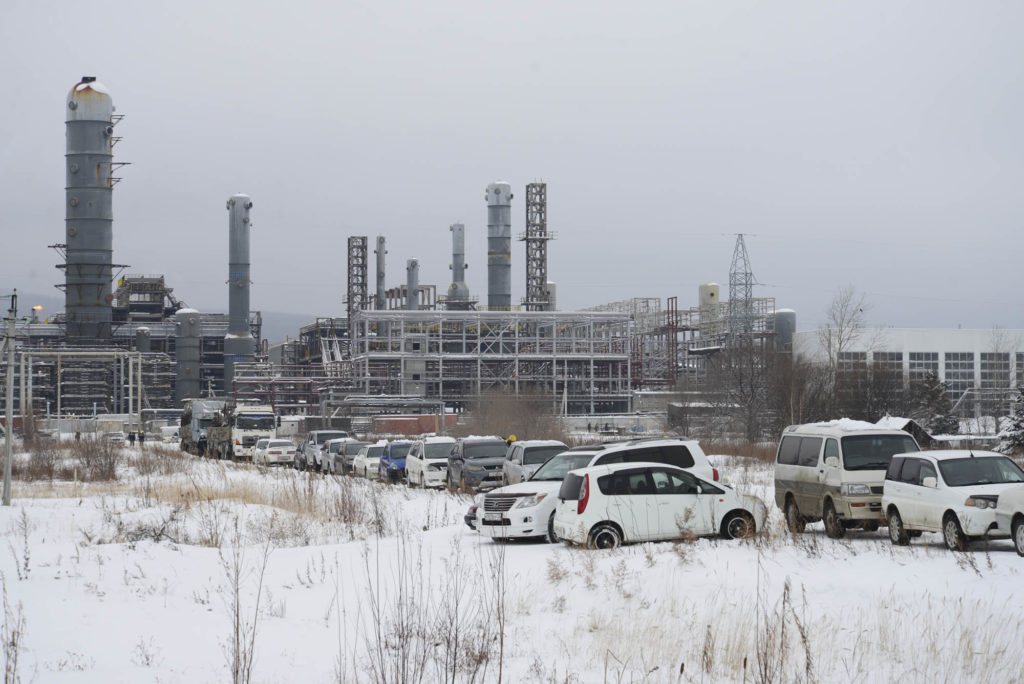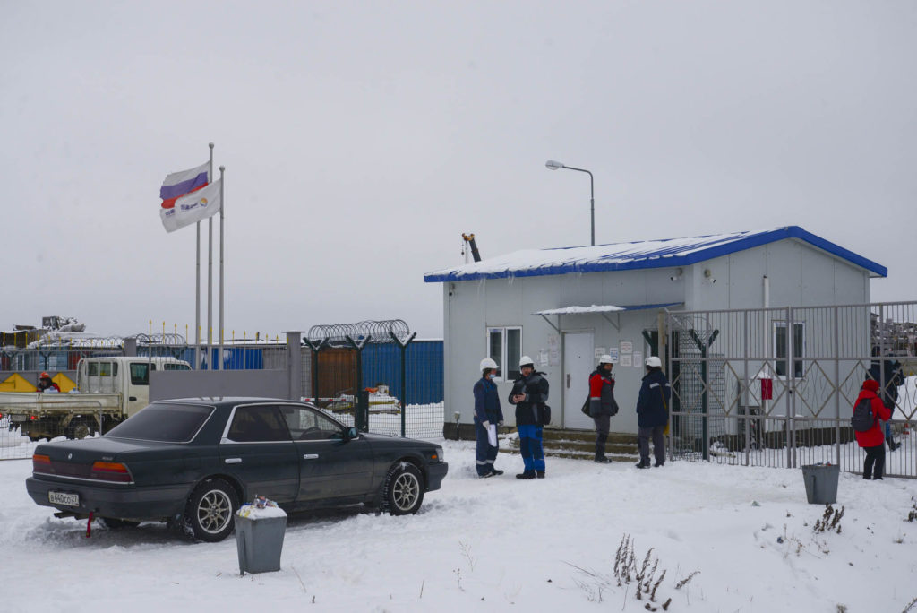 Мы выехали на место, чтобы увидеть своими глазами, что же сегодня происходит в этом месте. Городок китайских строителей находится рядом с Комсомольским нефтеперерабатывающим заводом – справа от дороги, что идёт мимо предприятия в сторону Шарголи. Уже на подъезде к городку стояло много машин, в том числе полицейских, так что припарковаться было достаточно трудно.