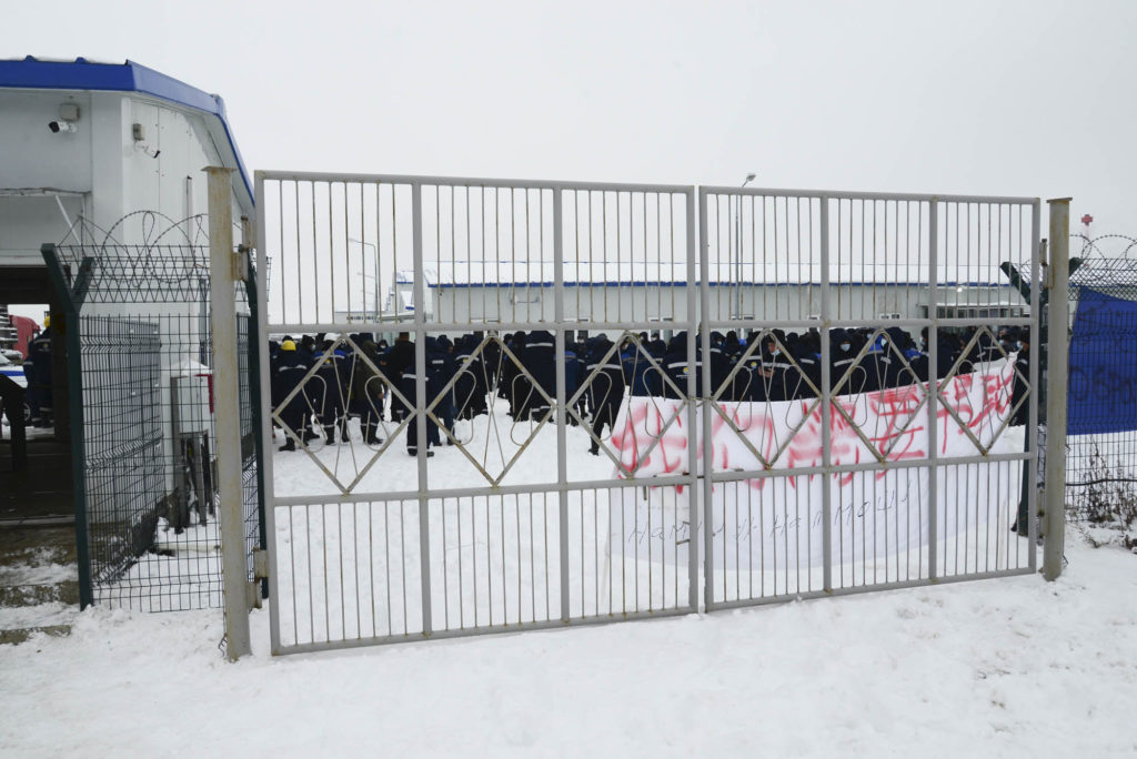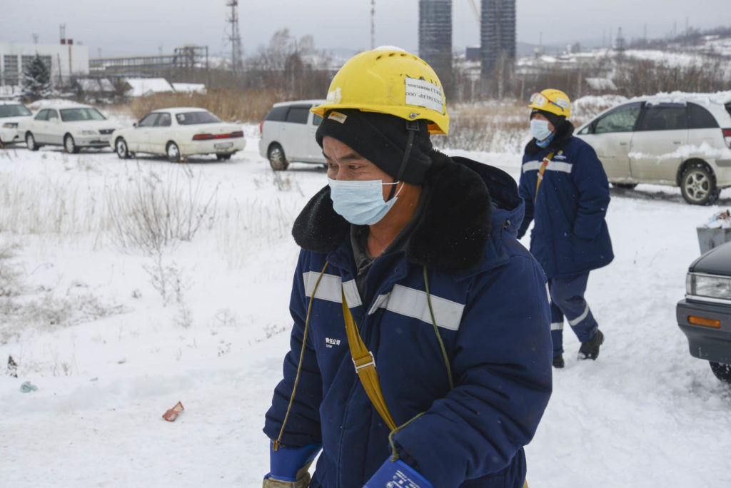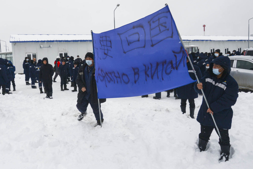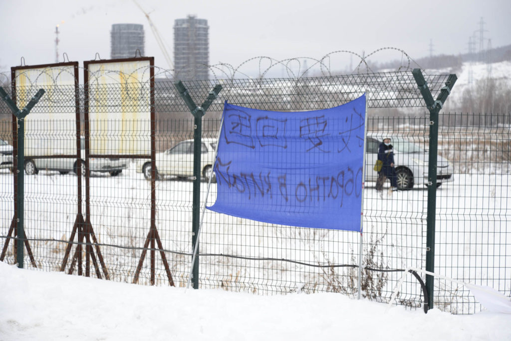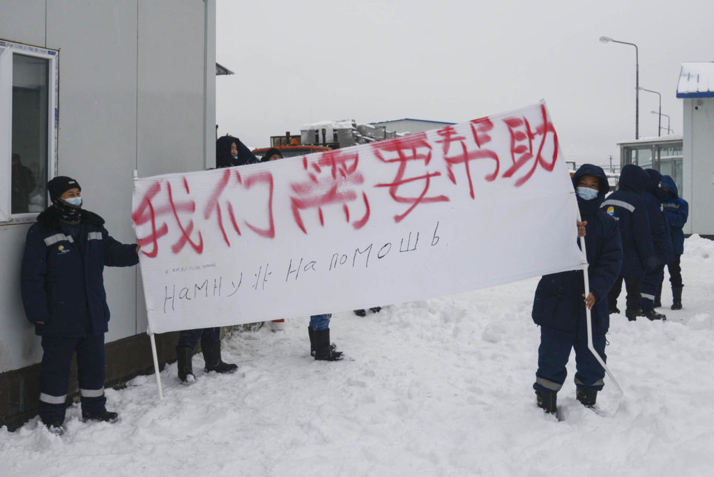 Сквозь забор городка было прекрасно видно: на его территории действительно стоит большая группа китайских рабочих. Кстати, практически все они были в медицинских масках. Толпа явно была перевозбуждена. Увидев журналистов, рабочие развернули в нашу сторону транспаранты с надписями, сделанными на китайском и русском языках: «Обратно в Китай» и «Нам нужна помощь». К сожалению, мы не смогли найти ни одного рабочего, кто свободно говорил бы по-русски. Но те, кто выходил за пределы проходной, в ответ на просьбу обрисовать ситуацию писали на снегу слово «SOS».