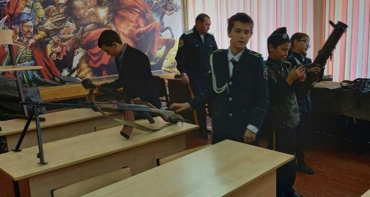 На переменах ребята бегали на выставку оружия повертеть в руках пистолеты, сфотографироваться с «калашом» и прикинуть на плече вес РПГ. А ещё – посмотреть выступление отряда барабанщиц и шоу с развёртыванием флага; послушать, как поют в школьном коридоре «Выйду ночью в поле с конём» группы «Любэ» – песню, которая давно стала народной. Кто хотел – пробовал постичь азы фланкировки. Это искусство владения кавалерийским холодным оружием, в том числе казачьей шашкой.