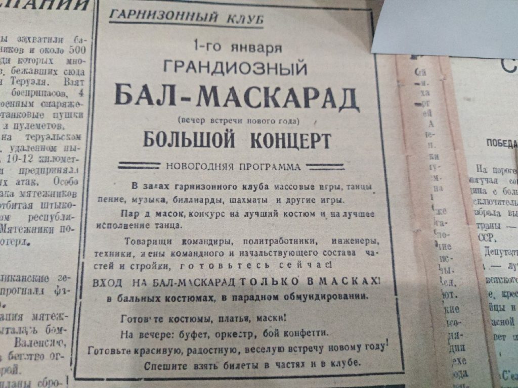 Самого первого новогоднего выпуска газеты 1932 года, к сожалению, обнаружить не удалось, однако 30-е годы не прошли мимо. В краеведческом музее мы обнаружили уникальный экземпляр – праздничный выпуск 1937 года. В нём, к примеру, было размещено объявление о бале-маскараде, который должен был пройти в гарнизонном клубе. Как и сейчас, существовало главное условие допуска на это массовое мероприятие – вход только в масках. Правда, те маски были более позитивными, чем нынешние.