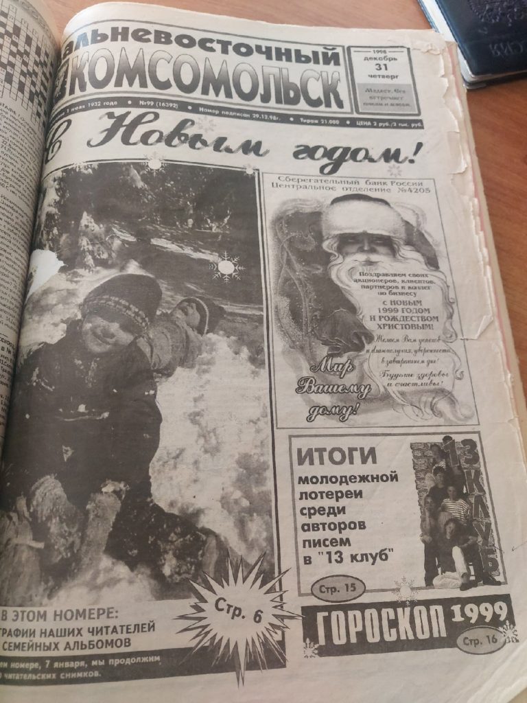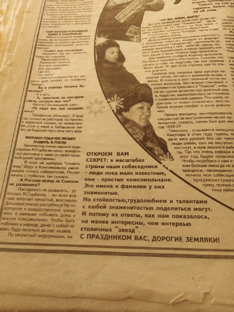 В номерах за 90-е годы впервые появляются анонсы новогодних сказок. В ДК авиастроителей в рамках праздничного представления Деда Мороза всех спасал капитан Врунгель, а в ДК судостроителей для поиска новогоднего волшебника и его внучки пригласили самого Шерлока Холмса. Здесь же можно найти поздравления и обращения от известных людей, не только представлявших администрацию города. В газете от 1992 года своими пожеланиями делился почётный житель Комсомольска Геннадий Хлебников.