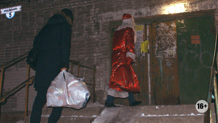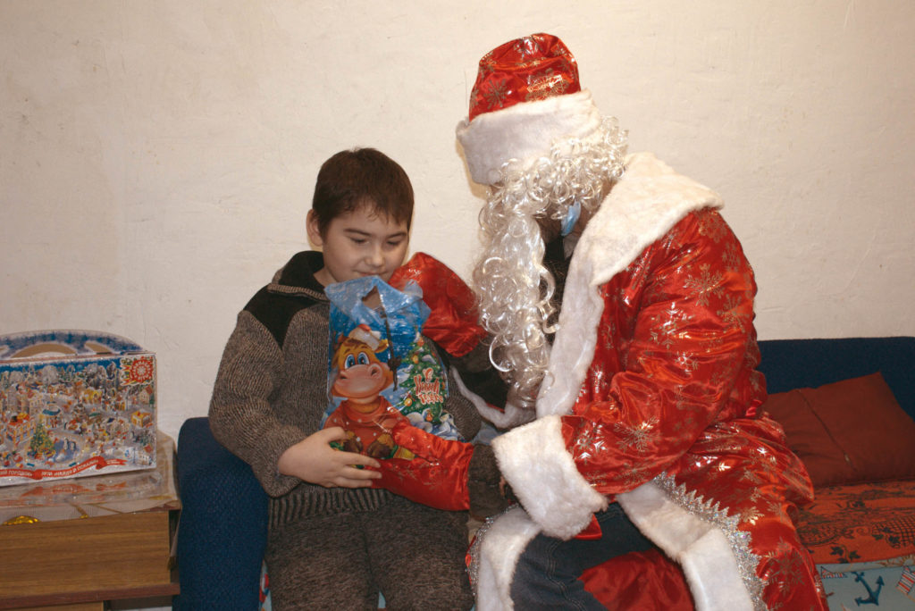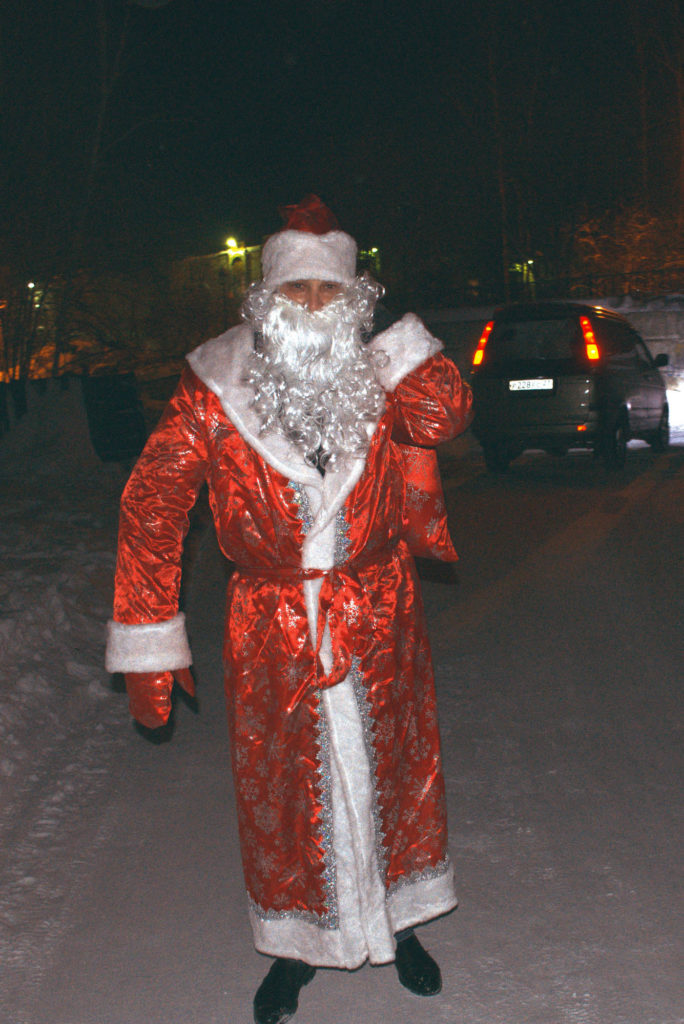 – Ну-ка, доставай конфеты, – поворачивается Дед Мороз к помощнику (это был знакомый из общественного совета города). Отсыпал горсть, пошёл дальше.