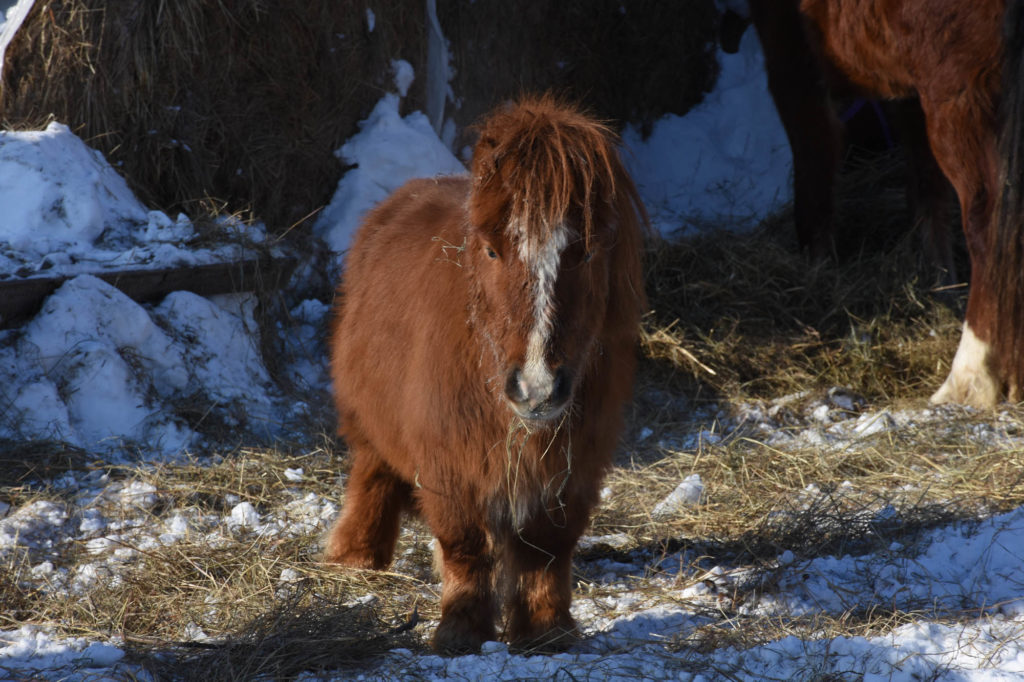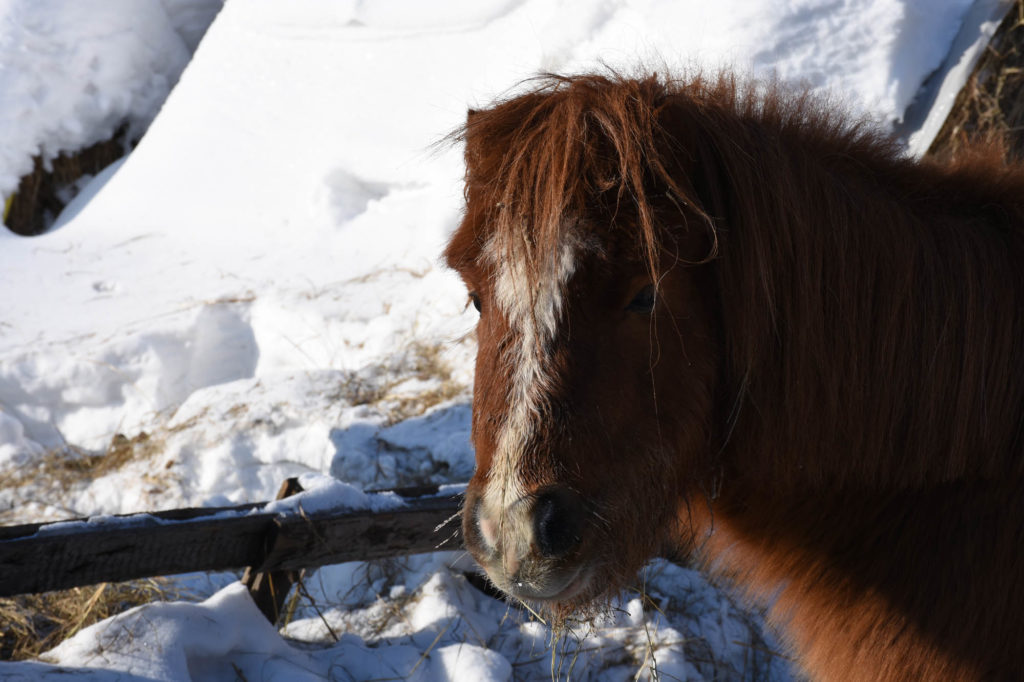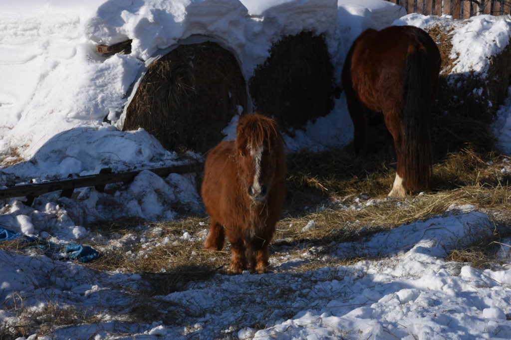 Потом настала очередь для двух лохматых пони и кобылы Флики. Пони крошка Ваня несмело пытался перешагнуть своими короткими ножками через небольшой барьерчик, а чёрно-белая Баунти оказалась настолько общительной, что сразу подошла к гостям, так и норовя куснуть за перчатку. Впрочем, по словам Данила, это просто безопасное заигрывание. Флика мастью похожа на Тучу – такая же рыжая, но на ногах белые носки. Похоже, она была заводилой в этой компании – пожевав сена, повела обоих пони по двору куда-то за дом, а Баунти и Ваня послушно и преданно семенили за ней.