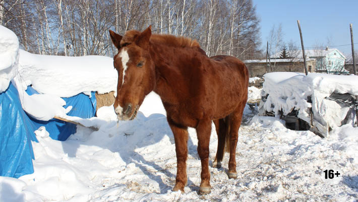 Всего же в хозяйстве Данила три коровы, шесть телят и, помимо больной кобылы, ещё три лошади. Данил вывел погулять саму Тучу. Я, конечно, не являюсь экспертом в ветеринарии, но 16-летняя Туча, на мой взгляд, сегодня выглядит не только здоровой и ухоженной, с аккуратно подстриженной гривой, но и жизнерадостной. Она то подбирала пучки сена со снега, то вдруг взбрыкивала и мчалась по двору, словно появились какие-то срочные дела, то как собака каталась по снегу.