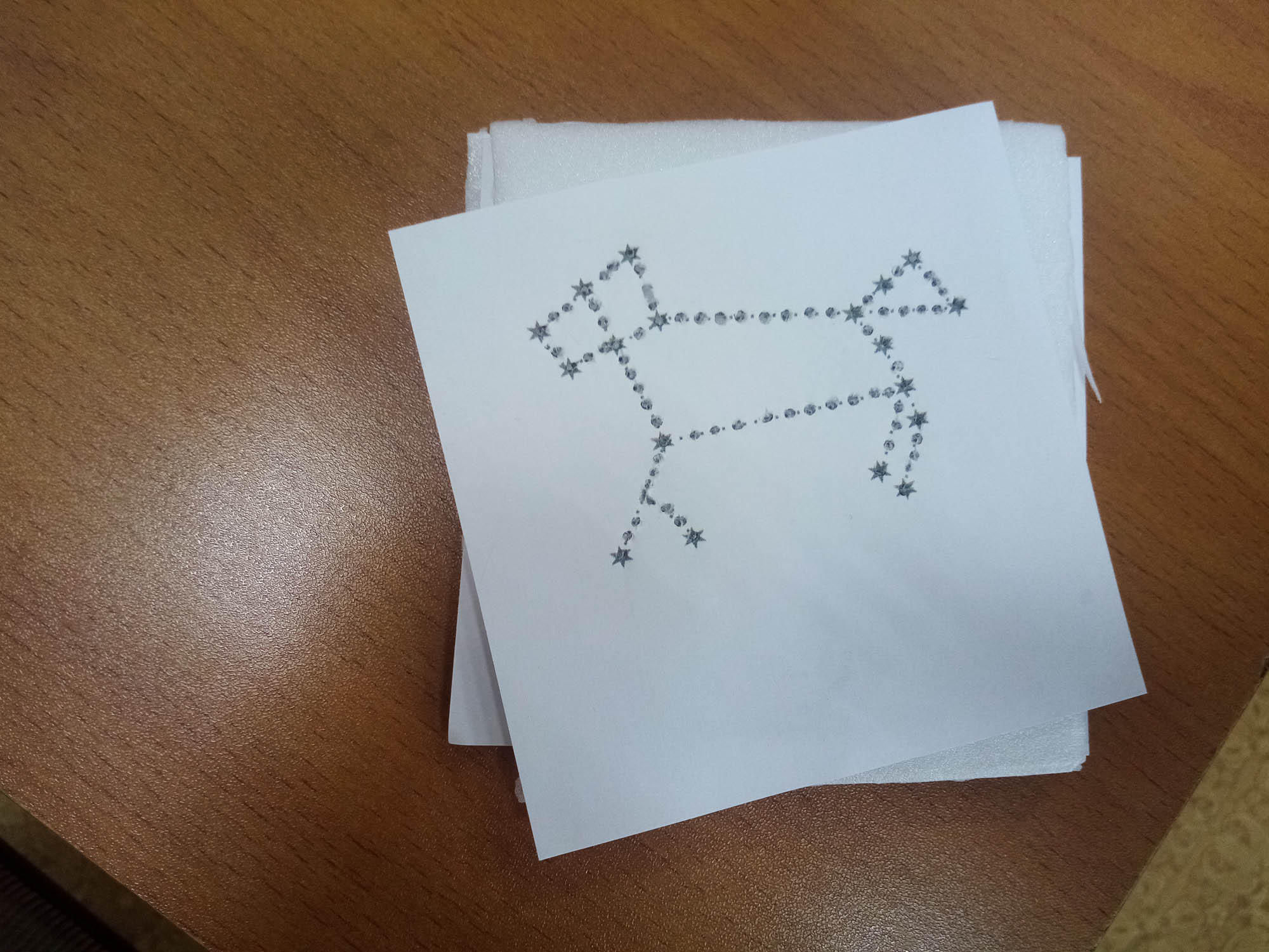 Также ребята сами изготовили созвездие Большого Пса, проткнув с помощью пенопласта на бумаге контурные точки, а затем с помощью фонарика в темноте спроецировали созвездие на стену. Картина, согласитесь, также впечатляющая. Можно почувствовать себя в космосе!