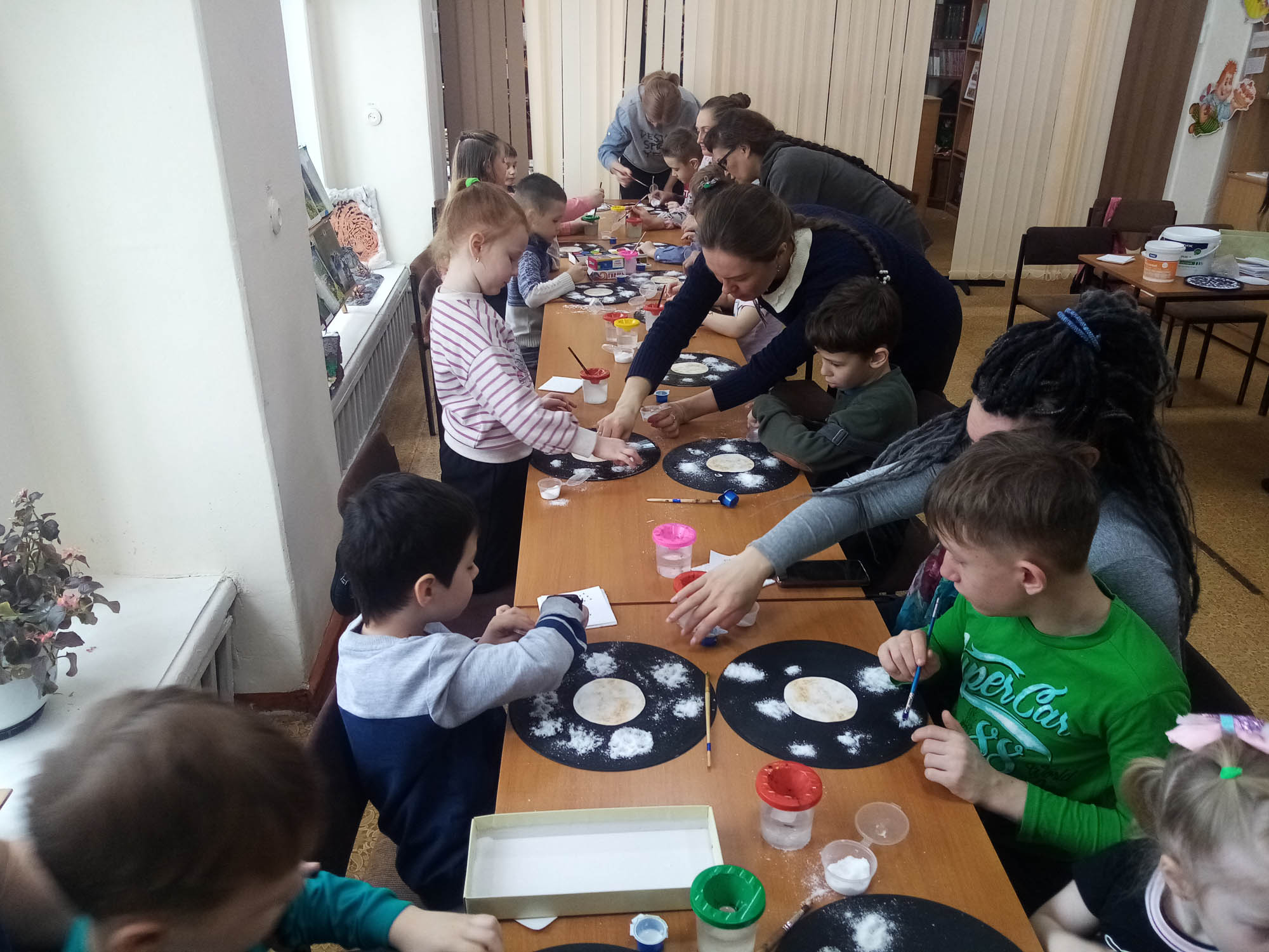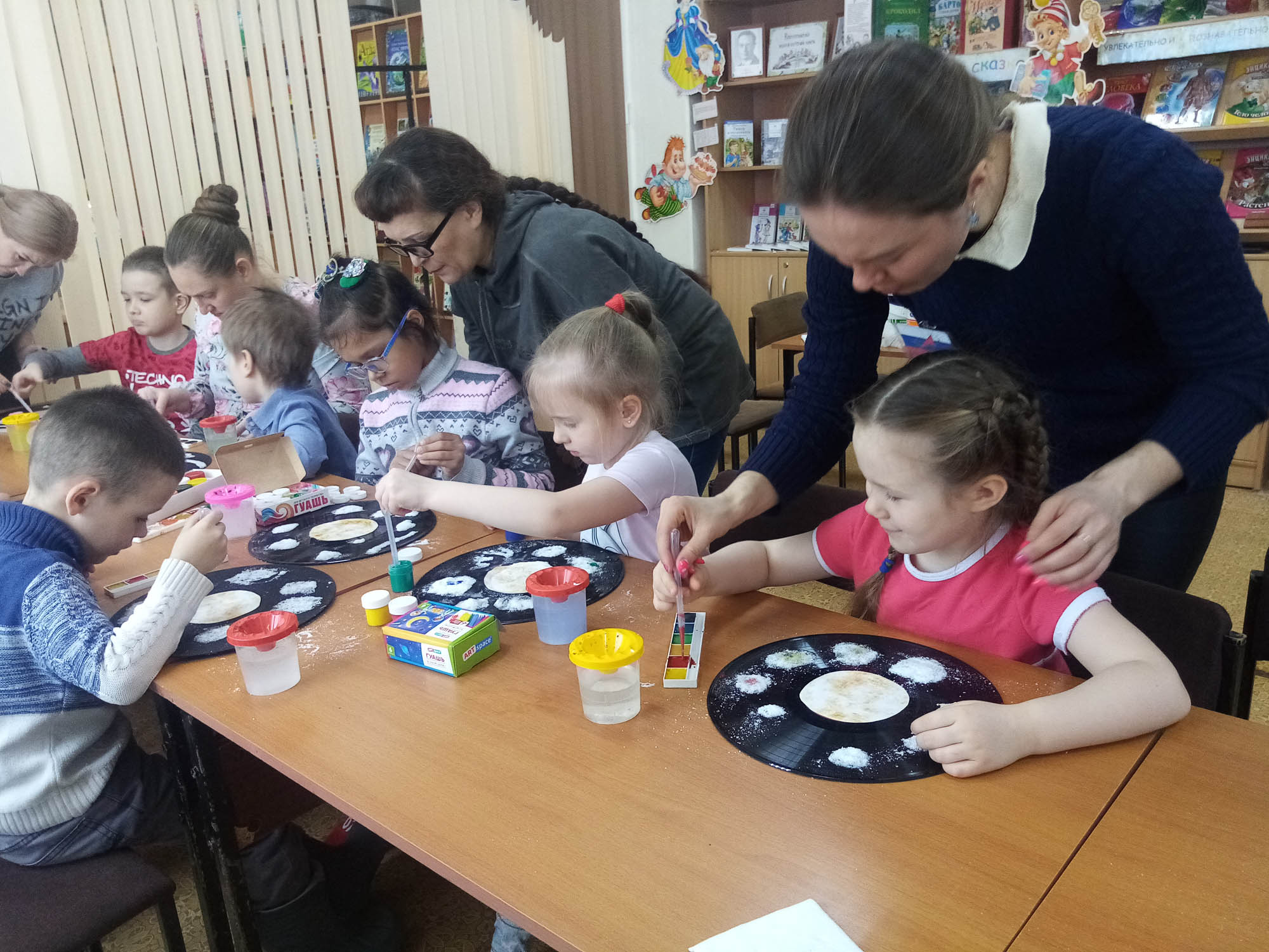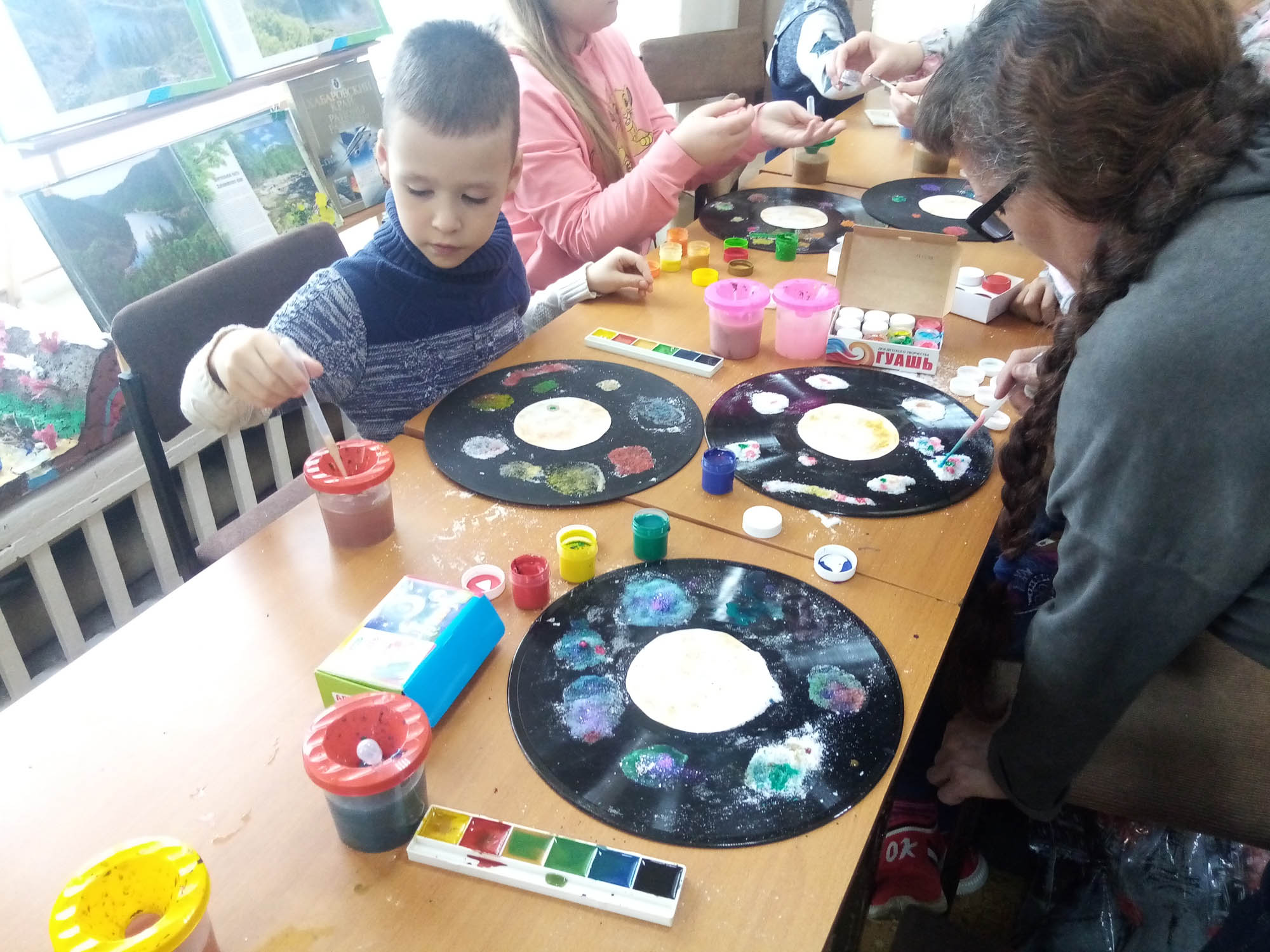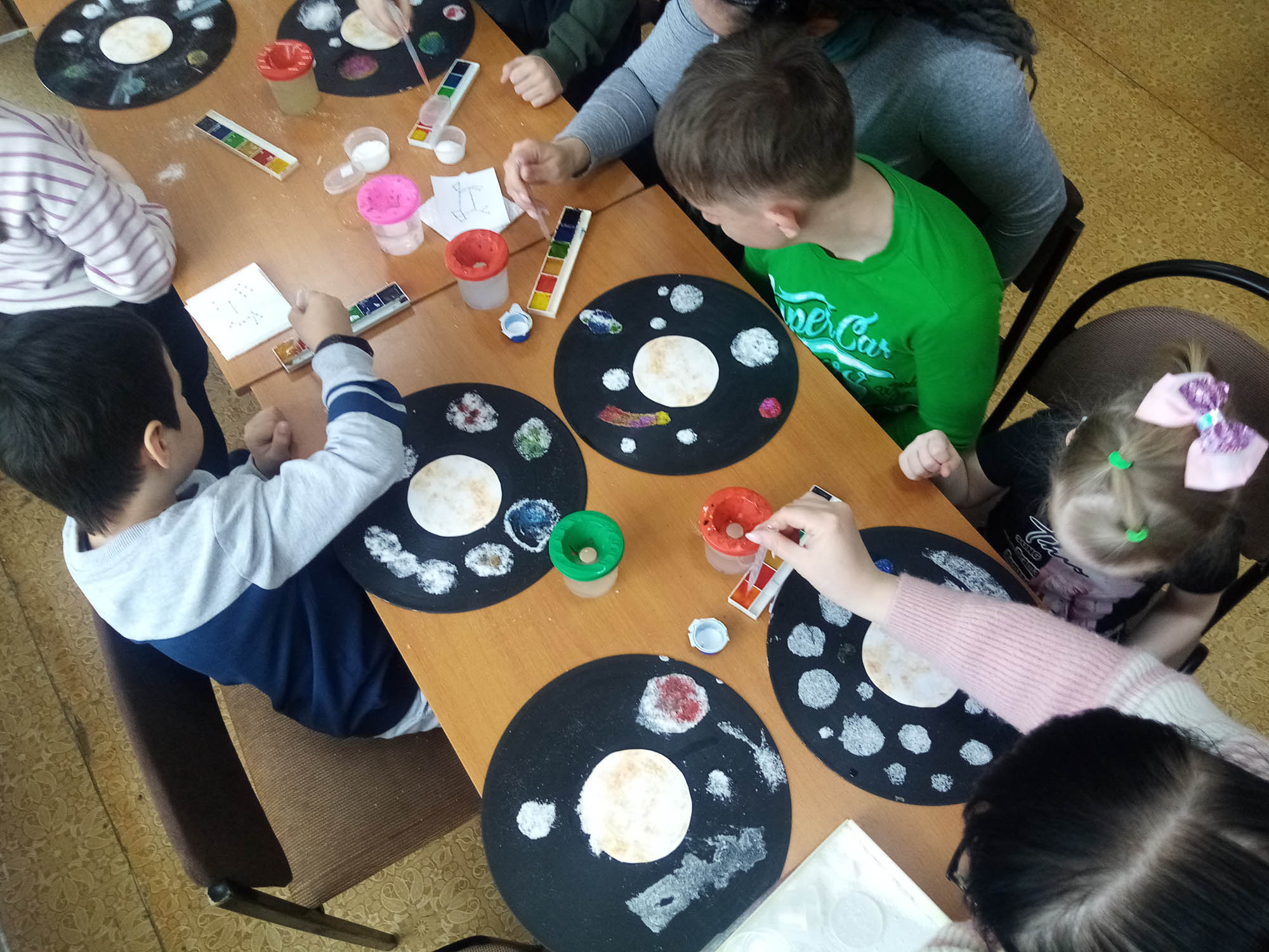 Завершающим на космическом занятии стал мастер-класс по изготовлению собственной Солнечной системы со своими планетами, кометами и звёздами. Такое чудо можно сделать благодаря старой граммофонной пластинке. На её космическом чёрном фоне и получились новые системы планет. Делалось это с помощью клея, щепоток соли, воды и краски. Вся работа, которую проделали дети, даёт богатый опыт тактильных ощущений, учит чувству пропорции, позволяет ощутить себя творцами космической красоты.