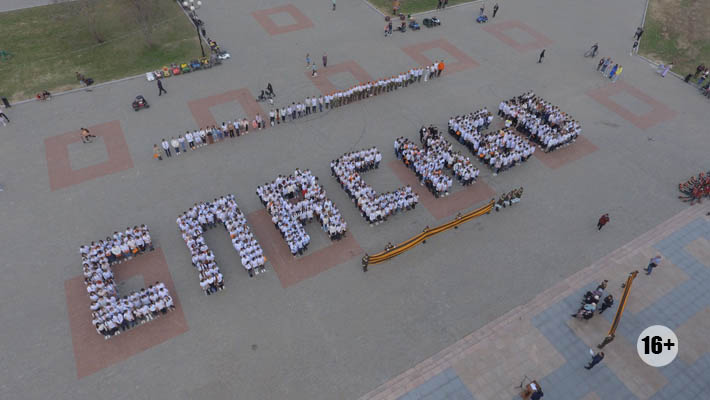 Молодые люди выстроились в слово «Спасибо» и спели одну из главных военных песен — «День Победы». На празднике присутствовали почётные гости — участники и дети войны. Они с благодарностью слушали поздравления и вспоминали военные годы. Жительница блокадного Ленинграда Валентина Переверзева до сих пор помнить ужасный голод, с которым пришлось столкнуться в военное время.