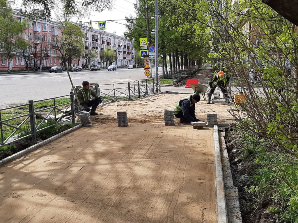 На пр. Октябрьском (от ул. Комсомольской до пл. Ленина) завершена установка бордюров, начали ремонтировать тротуары. На пр. Октябрьском (от ул. Дзержинского до набережной) установили бордюры, привели в порядок тротуары, подготовили основание для укладки нового асфальта.