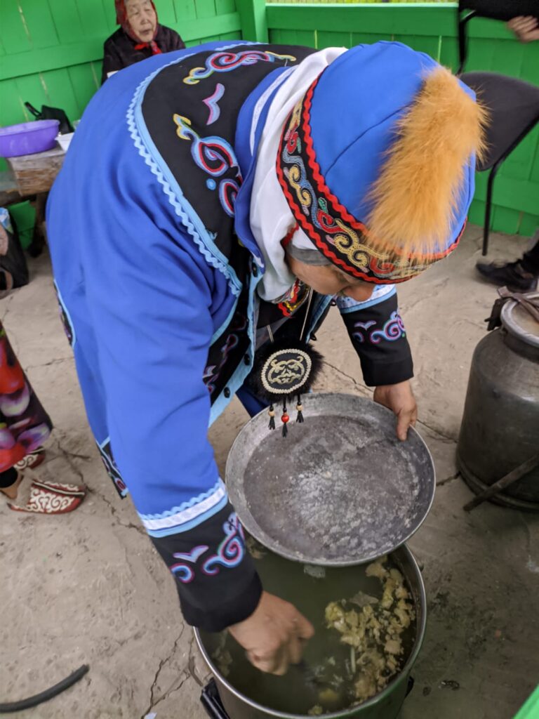 Божества накормлены – можно и гостей потчевать. Дружная компания женщин из села Джуен Амурского района привезла национальных разносолов, собственноручно ими приготовленных: здесь и печень изюбря, и мясо – утиное да медвежье, и рыба, и щучья икра. Полынный супчик и тот с собой привезли, так что, пока в большом котле готовился свежий, горячий, можно было продегустировать и холодный – он хорош и в таком виде. Рецептом приготовления поделилась Галина Киле. Заготавливается молоденькая, ещё не огрубевшая полынь в мае – самые нежные её части, верхушки. Их отваривают, затем хорошенько обжаривают в масле. А тем временем на плите уже подходит основа для этого блюда: варится бульон из рыбы (лучше использовать сома, потому что он очень жирный и даёт необходимый навар) с добавлением картофеля. Сюда же добавляют своеобразную затирушку из муки, получается что-то вроде мелких-мелких галушек — они придают супчику густоту и сытность. В конце закидывают обжаренную полынь и заправляют сушеной, солёной или тушёной черемшой – супчик соакта чолани, невероятно вкусный и ароматный, готов.