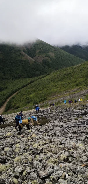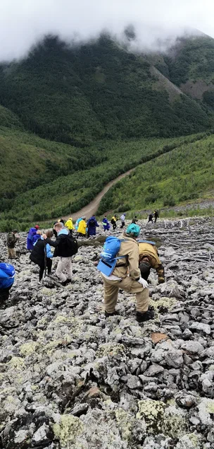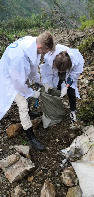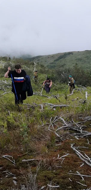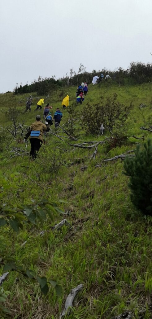 Наградой за проведённую уборку стал вкусный обед и последовавшее за ним восхождение на безымянную гору высотой 1290 метров. Несколько раз волонтёры ощущали себя ёжиками в тумане, а когда поднялись на вершину, облака будто начали с нами красивую игру, поочередно открывая и закрывая виды то на одну вершину, то на другую.