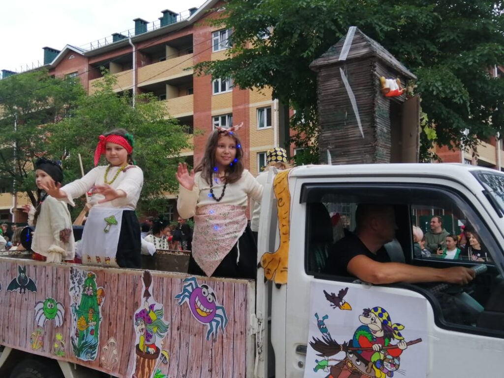 На площади ДК Авиастроителей карнавальное шествие встретили сизый дым шашлычных мангалов и палатки с разного вида вкусняшками и рукодельными поделками. Профессиональные гримёры разрисовывали лица детей аквагримом. Привычно отрабатывали праздничную программу лошади, катали детвору и позировали фотографам.