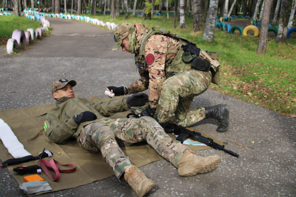 На станции «Тактическая медицина» команде нужно было спасти условного пострадавшего и эвакуировать его как можно быстрее в безопасное место. Предварительно школьники вспомнили правила оказания первой медицинской помощи, а затем остановили кровотечение у «раненого».