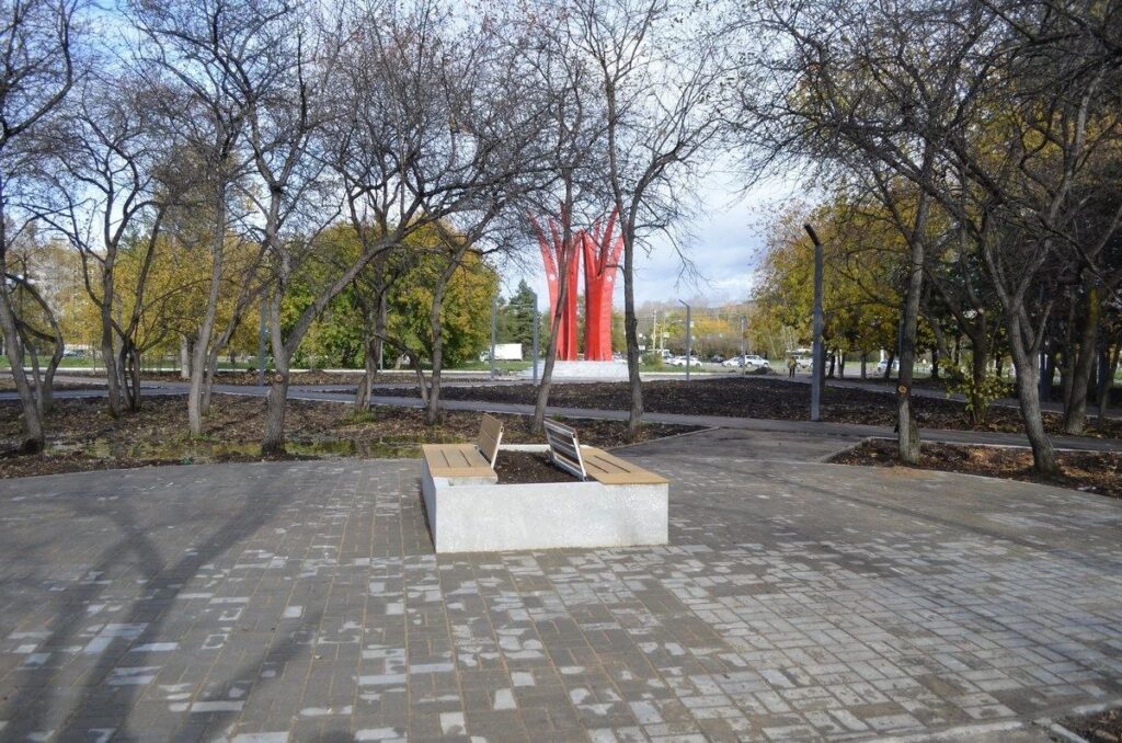 Сквер у гостиницы «Восход». Основной объём работ завершён, готовятся к установке урны, скамейки. Предстоит ещё установить видеонаблюдение. К подрядчику есть замечания по качеству. Также здесь полностью завершён ремонт памятника «Нерушимая дружба».