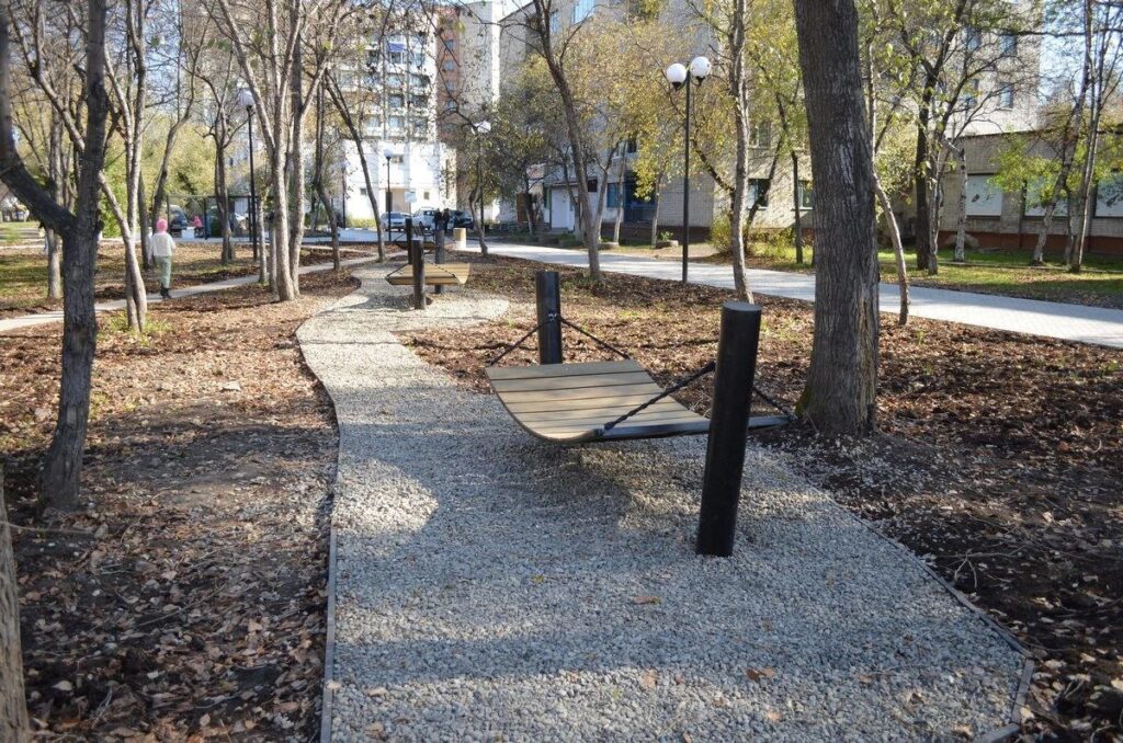 Мимо проходила пожилая женщина. Увидев комиссию, выступила с разгромной речью, что гамаки висят низко, детям неудобно, а кто постарше – вообще по ним ногами топчется. И зря пешеходную дорожку засыпали галькой. По камням ходить неудобно, их быстро распинают. Лучше бы песочком засыпали. Представители комиссии неожиданно спросили у пацанов лет десяти, которые тут качались: «А вам-то гамаки нравятся?» – «Да, прикольно». Насчёт камешков задумались: их и правда будут ногами разносить. Впрочем, как и песок. А топтаться ногами там, где нормальные люди сидят – это вопрос не к качеству работ, а к воспитанию молодёжи.