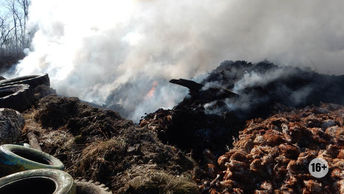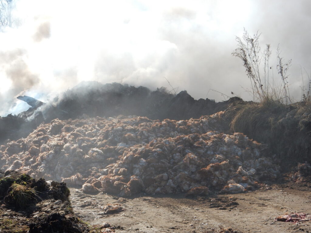 Тушки кремируют круглосуточно, открытым способом, прямо на пустыре в границах территории предприятия. Сначала выкапывают ров, устилают его шпалами и отработанными автомобильными покрышками – при сжигании они дают высокую температуру, отчего сырая биомасса быстрее горит. Примечательно, что жечь шины вот так просто на воздухе категорически нельзя – их с прошлого года на законодательном уровне запретили использовать даже в качестве клумб, украшений и ограждений где бы то ни было. Но у руководства птицефабрики нет иного выхода — сжечь нужно огромный объём – 500 экземпляров. А потому колёса для этих целей свозят сюда со всего города, даже со стихийных свалок. Режим чрезвычайной ситуации, впрочем, легализует сожжение покрышек – и его ввели, хоть и задним числом. Ну, а жителям микрорайонов, которые окутывает дым и гарь от горящих кур и резины, увы, придётся потерпеть эти неудобства.