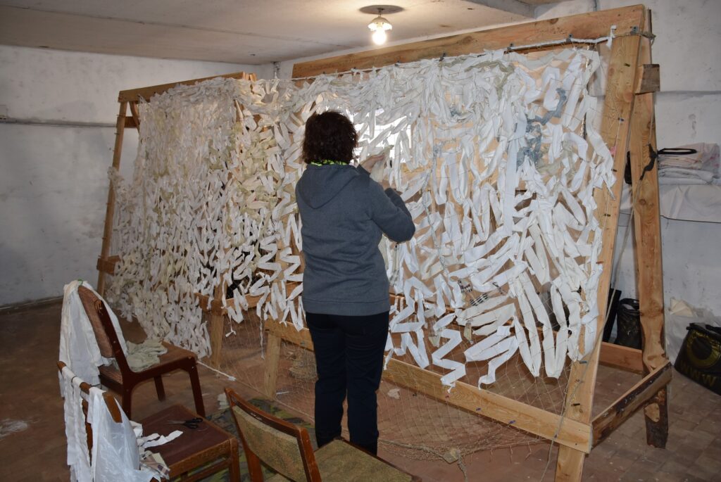 Первым делом комсомольские активисты нашли себе место под мастерскую. Помогла управляющая компания ООО «Веста», отдав свободное полуподвальное помещение в жилом доме по улице Кирова, 26. Свет там был, обогреватель свой принесли. Кинули клич по знакомым и Интернету, что нужны старые рыбацкие сетки, белые простыни и тряпьё. И ещё нужны помощники. Призванные на помощь мужички сколотили из закупленных досок здоровенные конструкции, похожие на мольберты, – на них развешиваются сети для дальнейшей работы. Энтузиасты прошлись по местным ателье, и швеи согласились отдавать им обрезки тканей. Знакомые и незнакомые горожане стали звонить и привозить старые сетки и белую ткань. Сочувствующие женщины, в том числе проживающие в доме ветеранов, взялись резать приносимые простыни на полоски.
