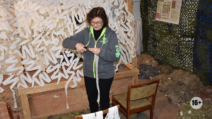 Каждого пришедшего предстояло посвятить в специфику технологического процесса. Простое, казалось бы, дело на самом деле таит много премудростей. Например, вплетая тканевые полоски, надо следовать одному из существующих «узоров», предназначенных для применения в разных условиях. Если это маскировочная сеть для техники, то тряпками надо закрыть 100% поверхности сети без всяких просветов. А если для личного состава, то надо закрыть на 80%, чтобы спрятанные от вражеских глаз бойцы могли вести наблюдение сквозь прорехи. Индивидуальная масксеть для солдата имеет размер два на два метра. Для техники готовятся покрывала размерами три на четыре или четыре на четыре метра, а потом – уже на передовой – их соединяют в одно большое соответственно размеру машины. Для зимы используется цветовая схема «грязный снег»: белая основа с темными пятнами. А дополнительно к тряпкам надо ещё навязать пучки сантехнической пакли, чтобы колыхались на ветру, будто пожухлая трава. По краям надо привязать бесформенную бахрому, чтобы размыть контуры сети.