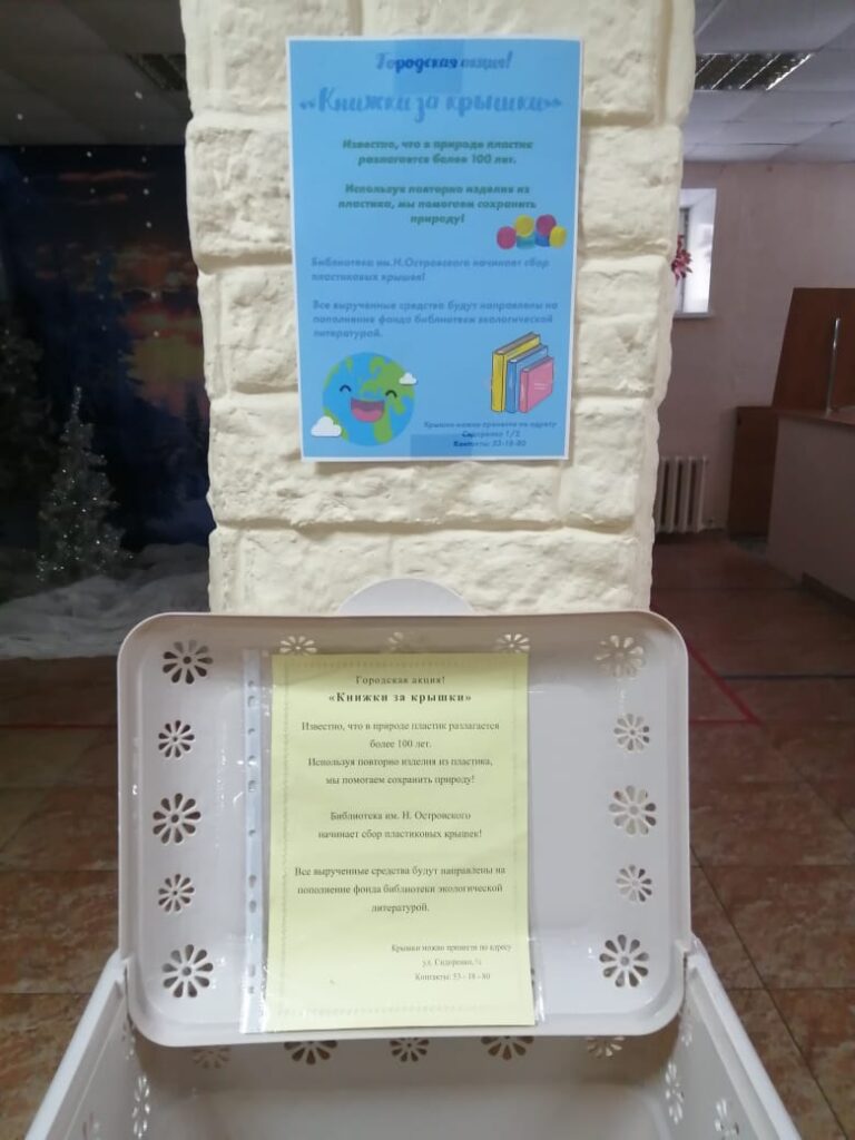 Кстати, рядом со столом буккроссинга проходит благотворительная акция «Крышки за книжки». Посетители приносят пластиковые крышки, сотрудники библиотеки собирают, взвешивают, сдают, получают деньги и на вырученные средства приобретают литературу на экологическую тему. Только за прошлое лето было собрано а порядка 40 килограммов пластика.