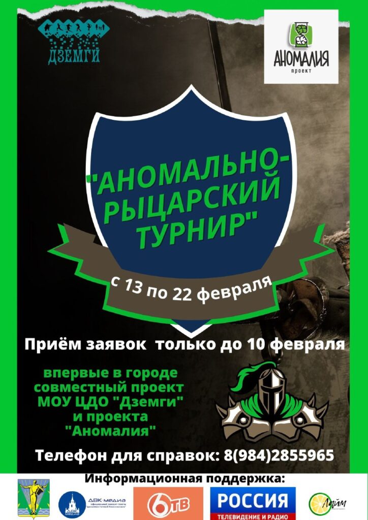 Молодёжный центр «Дзёмги» совместно с компанией по организации квестов и праздников «Аномалия» объявил о проведении «Аномального рыцарского турнира». В деле только парни 12-14 лет: собравшись в команды по шесть человек, они будут проходить десятидневный марафон разнообразных заданий. Турнир стартует 13 февраля и завершится как раз ко Дню защитника Отечества.