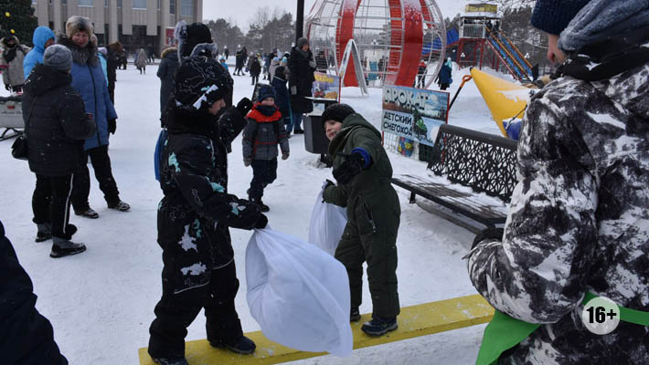 Вот малышня катается на пони; визжит на горках, оседлав папу; прыгает через скакалку и получает призы; лупится подушками, сделанными в виде огромных пельменей. Проигравший паренёк теряет равновесие, падает с узкой скамейки и смеётся, а победитель требует с организаторов заслуженные конфеты и просит о новой схватке.