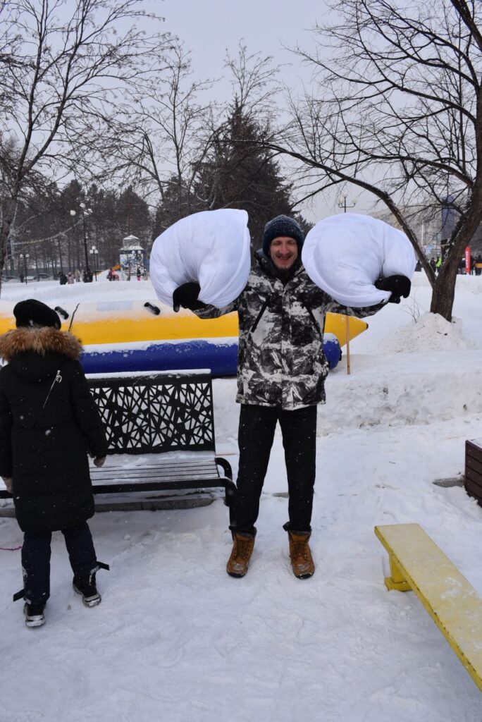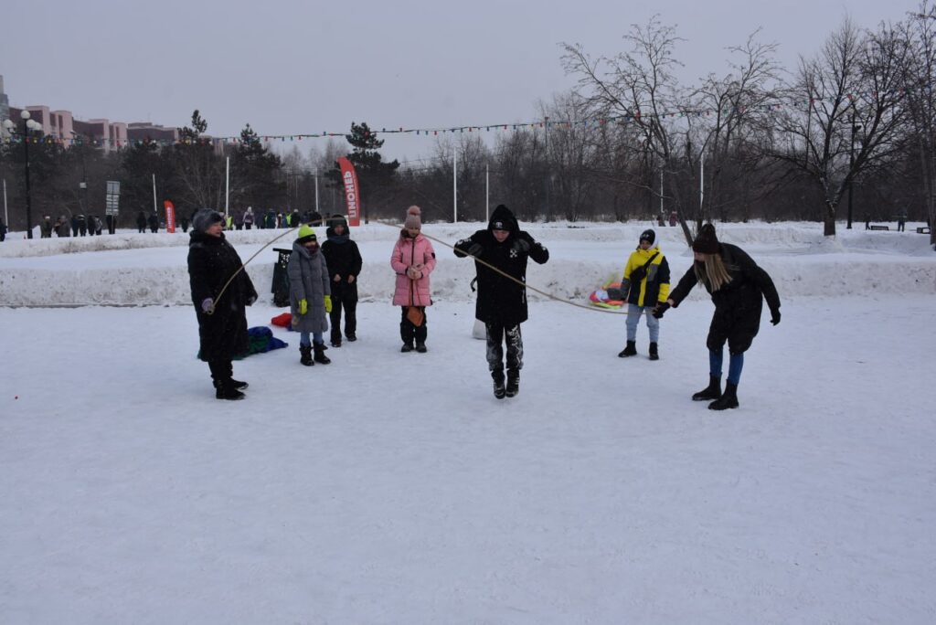Рядом с площадкой пельмекёрлинга взрослые мужики, обутые в валенки, рубятся в мини-футбол. Балансируют и смешно буксуют по скользкой поверхности, разгоняясь для атаки; вратарь хватается руками за ворота, чтобы отбить удар и не упасть на лёд.