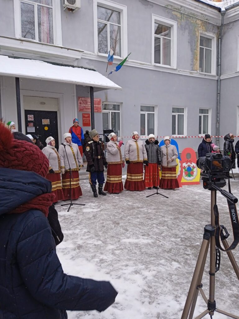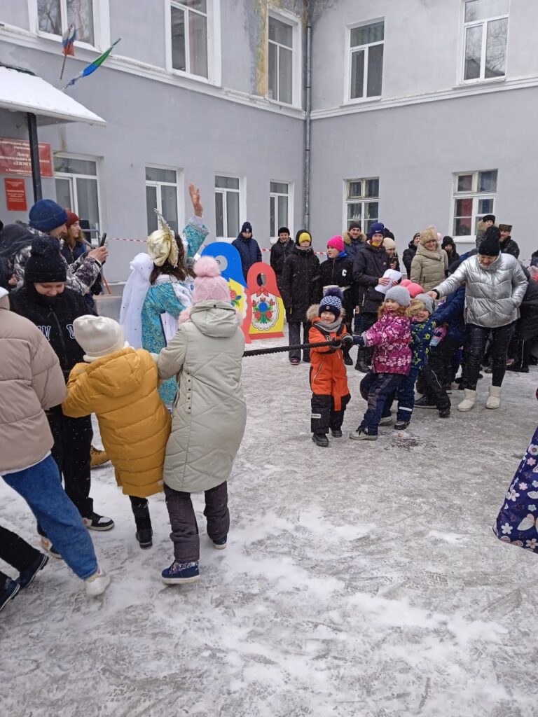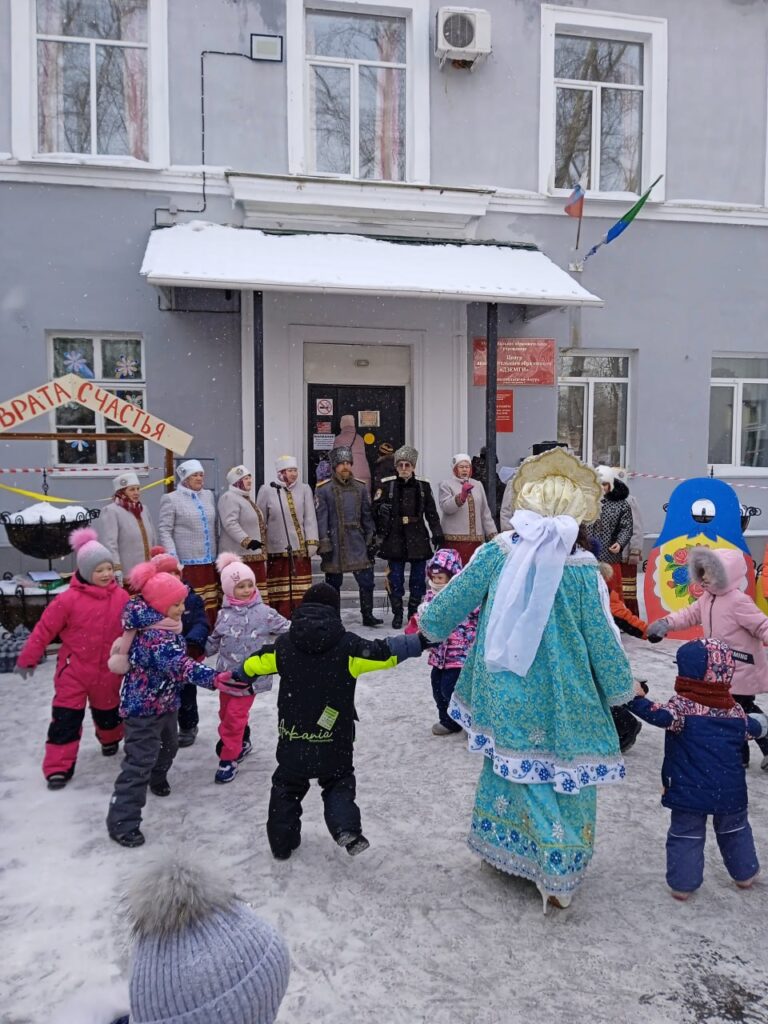 Во дворе у центрального входа центра «Дзёмги» казачий хор поёт народные песни; скоморох и Зима в кокошнике (педагог-организатор центра Юлия Ибрагимова) развлекают конкурсами: мороз не велик – на улице теплынь, а стоять не велит. В дело идут хороводы, перетягивание каната и подвижные игры. Снеговик, одетый типичным старшеклассником в узких джинсах, привязав к ноге шарик на верёвке, кружится в плотном кольце детей: выбивает зазевавшихся «снежочком из кружочка». Дети пищат, подпрыгивают и жульничают кто во что горазд, а помощники Зимы бдят и выводят из круга проигравших.