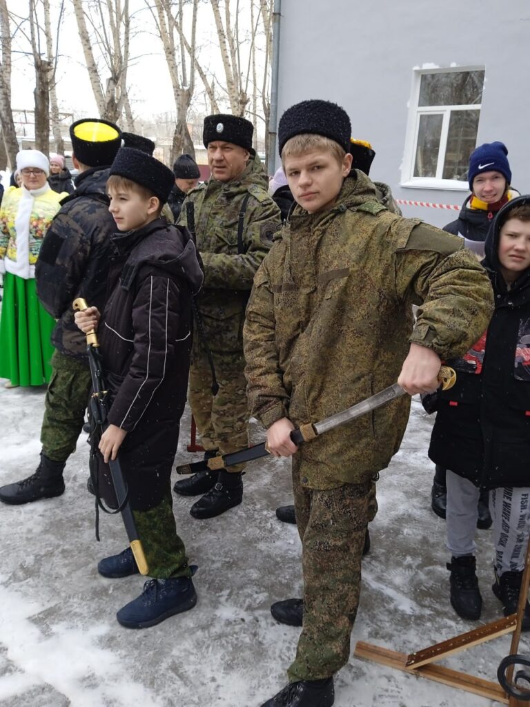Оправдывая казачий колорит праздника, ведущий объявил выход воспитанников военно-патриотического клуба «Пластун», и к зрителям вышли трое ребят из МОУ СОШ № 35. Это школа в микрорайоне Дружба, где уже много лет существуют кадетские казачьи классы. Их курируют офицеры из Станичного казачьего общества «Георгиевское» (дислоцируется в р.п. Солнечном, входит в Уссурийское войсковое казачье общество). Парни показали мастерство владения шашкой и нагайкой, крутя «восьмёрки» разной степени сложности, и ни разу не оборвались.