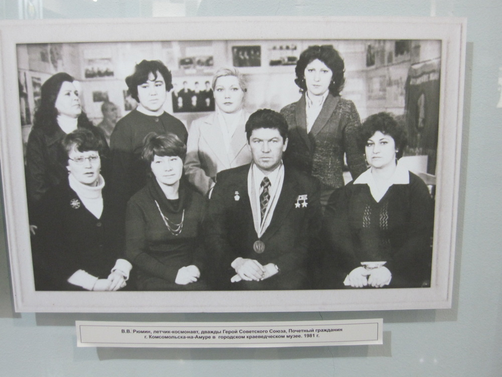 В 1981 году Валерию Рюмину было присвоено звание «Почётный гражданин города Комсомольска-на-Амуре», а на проспекте Копылова был установлен бронзовый бюст знаменитого земляка. В свою очередь Валерий Викторович подарил городскому музею свой тренировочный скафандр. До Рюмина звания почётного гражданина в 1967 году был удостоен космонавт Юрий Алексеевич Гагарин, который лично побывал в городе Юности.