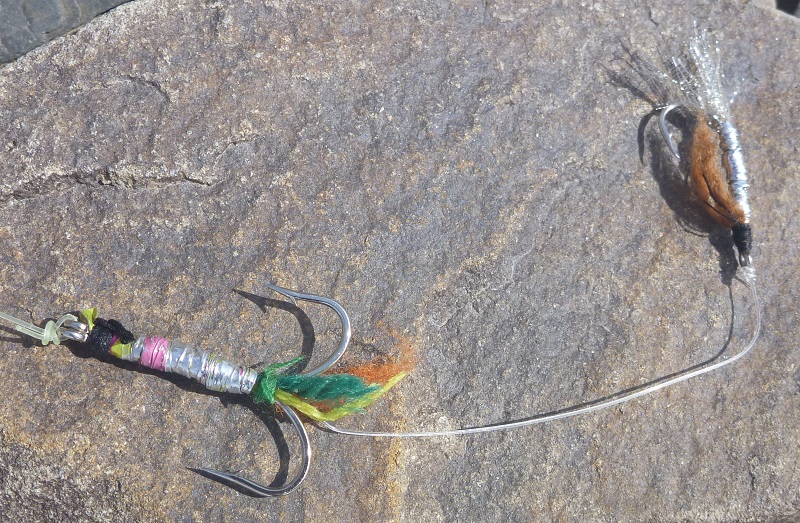 Мушка-тандем. Такие мушки одновременно работают на крупную рыбу (сом, щука, сазан, судак) и на небольшую (чебак, конь, сиг). К мушке, связанной на двойнике, привязывается ниже на 7-8 см небольшая мушка. Она может вязаться и выше мушки-двойника на поводке длиной 2-3 см.