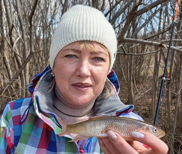 Тем временем по городской Силинке начали подниматься ленки и хариусы. Рыбы в ней немного, и поймать точные дни прохода царской рыбы сложно. Нам с женой захотелось провести пару часов на её берегах, и Лена отличилась. Но это была другая рыбка, очень редкая, больше живущая в самых верховьях Амура и в Китае… На удочку с червяком попался троегуб (не конь-трегуб!). Этот красивый маленький хищник имеет рот-замок, за что иногда его называют рыбой-замком.