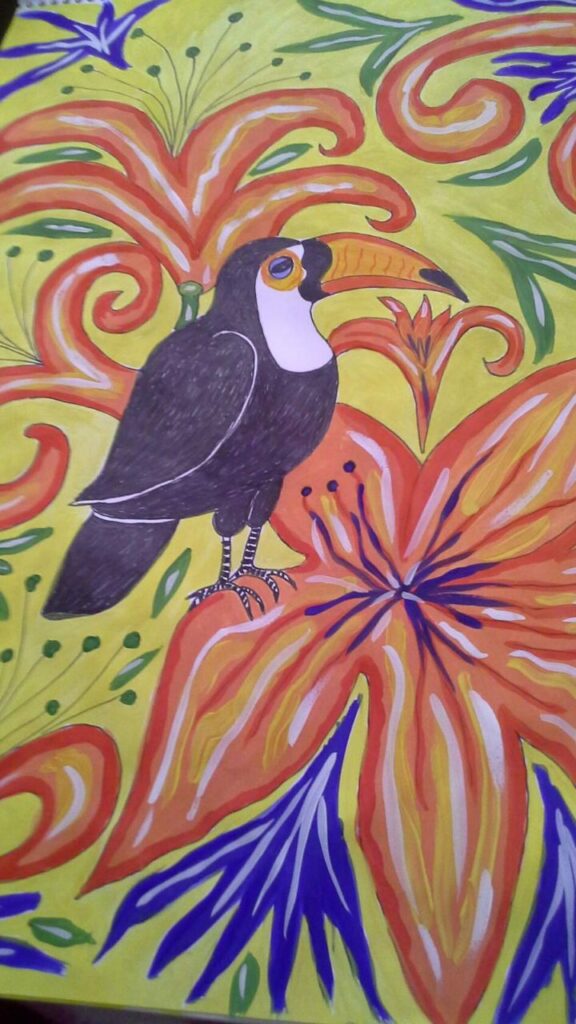 В живописи Наталье больше всего нравится рисовать пейзажи. Бумага, кисть, краски — и вот перед вами потрясающий зимний пейзаж, река, горы, тайга. На картинах Натальи Охотной распускаются цветы, пылает багрянцем осенний лес, порхают бабочки, несутся кони, позируют фантастической красоты птицы. Художница кистью и красками словно творит новую реальность, чтобы понять непознанное.