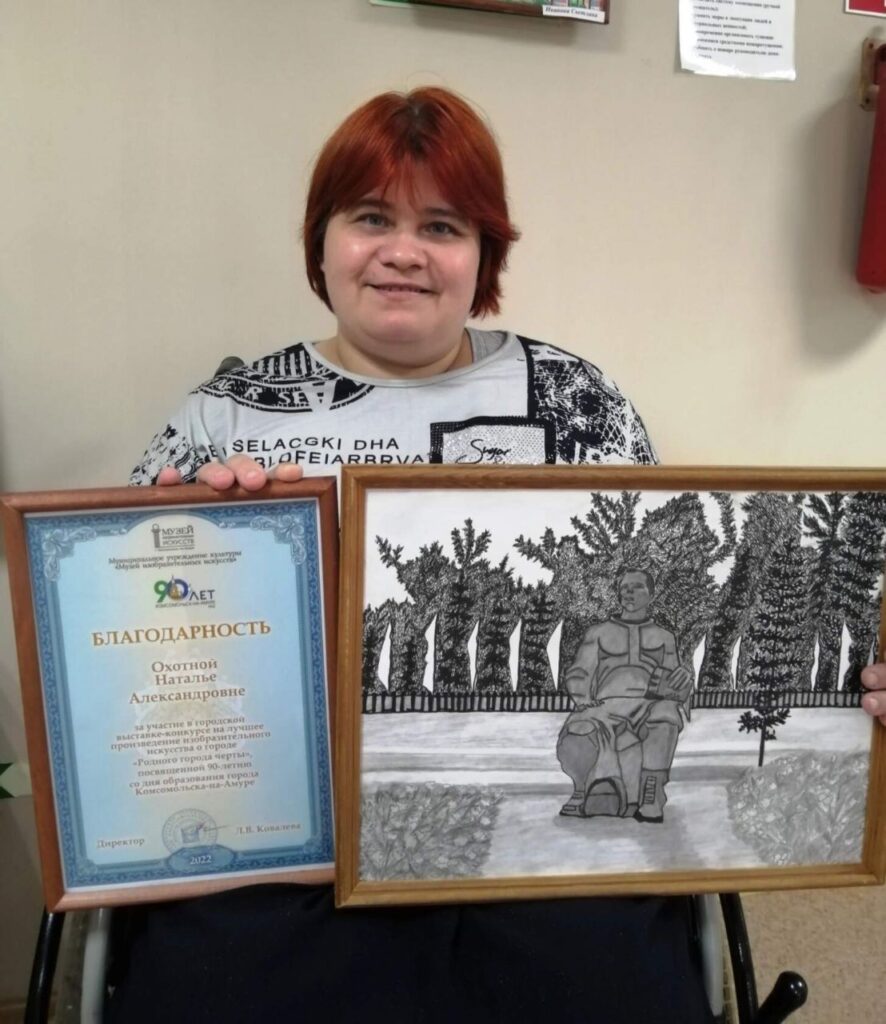 — Я рисую с детства, ещё в школе моё творчество отмечали на уровне Хабаровского края, по рисованию всегда были пятёрки. Впоследствии профессиональные навыки по живописи получила здесь, в доме-интернате, от художника Артёма Стампа. В мастерской под его руководством я училась, как правильно краски накладывать, оценивать композицию рисунка.