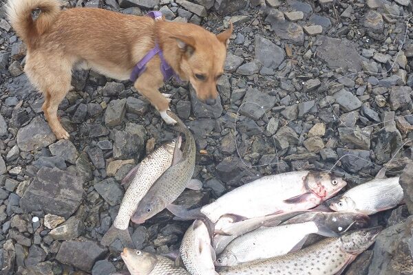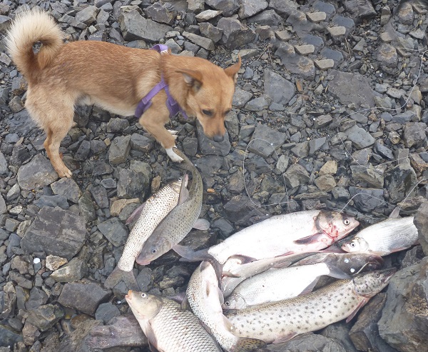 Два раза мы ловили рыбу на новом месте. Оно расположено ниже Верхней Экони перед большим сазаньим уловом. День выдался очень тёплым. Температура достигла 28 градусов! Здесь многолюдно, немало семейных пар. Многие загорают. Кто ловит разную рыбку закидушками, кто мушками донных амортизаторов, а другие горожане занимаются карп-фишингом. Вот у молодой пары в улове и кони, и сазаны. Молодцы! А у пожилой женщины-рыболова садок с пойманной рыбой сторожит королевский пудель. Мило наблюдать такую идиллию.