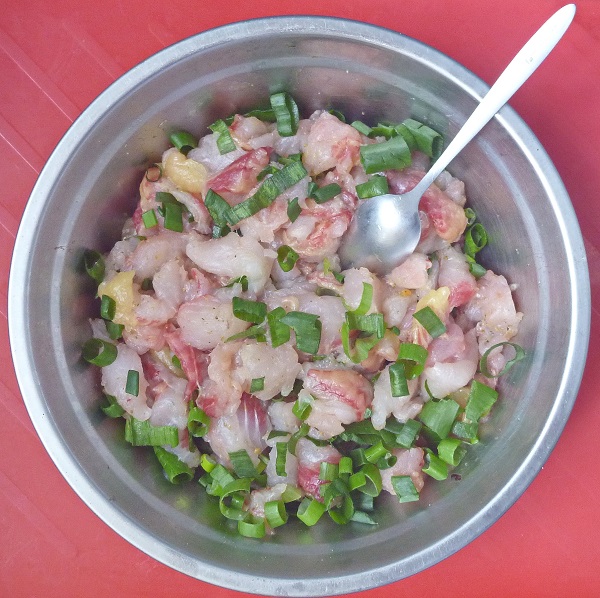 Поварской совет. Выбираем острым ножом мякоть мяса сома. А на усмотрение каждого повара желаемое количество жира. Полученные нарезки рубим на небольшие квадратики и перемешиваем. Солим, перчим, сдабриваем лимонной приправой для рыбы и добавляем репчатый или зелёный лук. Готовим кляр. 2 яйца, 3 щепоточки соли, 4 ложки муки. Тщательно размешиваем. Лепим «оладьи», окунаем в кляр и обжариваем на сковороде до золотистого цвета.