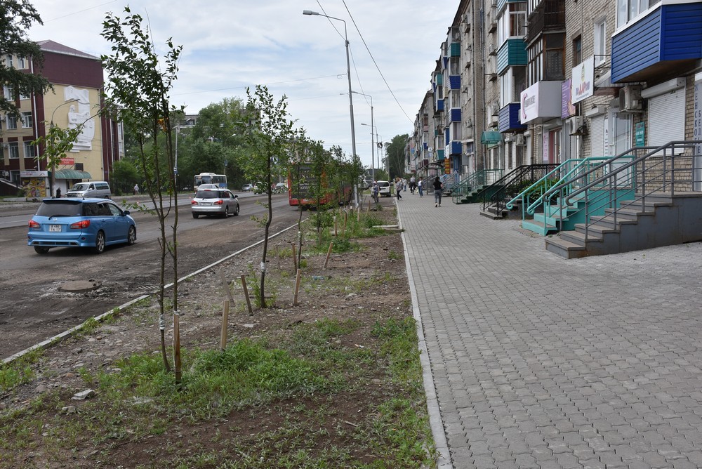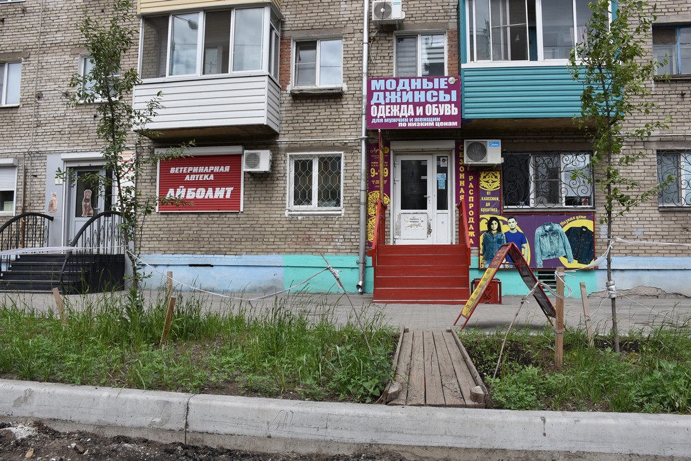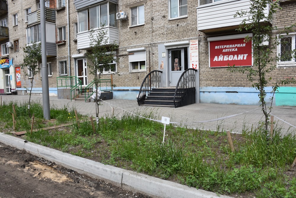За судьбу яблонь переживают и простые горожане. Есть, например, бдительная бабушка, которая часто здесь ходит и делает замечания тем, кто топчет газон и выгуливает между саженцами собак. Топчут его и посетители контор и магазинов, которыми щедро утыкана часть проспекта от Нарсуда до Металлургов. Люди паркуются у бордюра, а как до крыльца дойти? Только через зелёные насаждения, потому что газон сплошной и специальных дорожек через него от проезжей части к тротуару нет. Правда, сейчас напротив почти каждого заведения кем-то уложены деревянные настилы, чтобы снизить воздействие на почву. А ветеринарная аптека «Айболит» возле себя натянула ещё веревочное ограждение между настилами и воткнула в землю самодельные знаки, запрещающие ходить по траве. Потому что эту траву специально засеяли сотрудники аптеки и хотят, чтобы зелень побыстрее и пышнее разрослась.